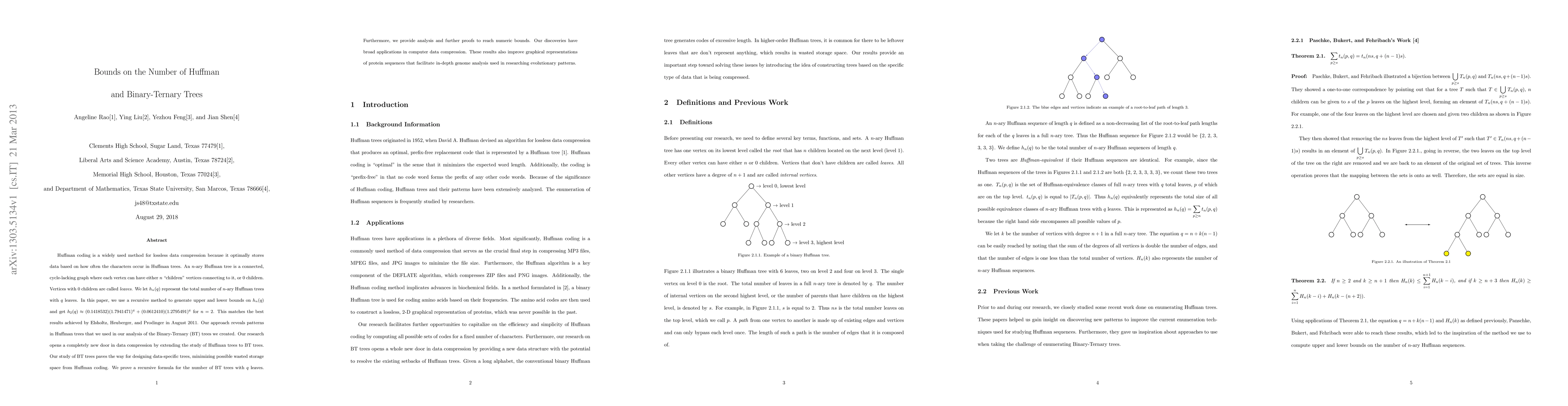Huffman coding is a widely used method for lossless data compression because it optimally stores data based on how often the characters occur in Huffman trees. An $n$-ary Huffman tree is a connected, cycle-lacking graph where each vertex can have either $n$ "children" vertices connecting to it, or 0 children. Vertices with 0 children are called \textit{leaves}. We let $h_n(q)$ represent the total number of $n$-ary Huffman trees with $q$ leaves. In this paper, we use a recursive method to generate upper and lower bounds on $h_n(q)$ and get $h_2(q) \approx (0.1418532)(1.7941471)^q+(0.0612410)(1.2795491)^q$ for $n=2$. This matches the best results achieved by Elsholtz, Heuberger, and Prodinger in August 2011. Our approach reveals patterns in Huffman trees that we used in our analysis of the Binary-Ternary (BT) trees we created. Our research opens a completely new door in data compression by extending the study of Huffman trees to BT trees. Our study of BT trees paves the way for designing data-specific trees, minimizing possible wasted storage space from Huffman coding. We prove a recursive formula for the number of BT trees with $q$ leaves. Furthermore, we provide analysis and further proofs to reach numeric bounds. Our discoveries have broad applications in computer data compression. These results also improve graphical representations of protein sequences that facilitate in-depth genome analysis used in researching evolutionary patterns.