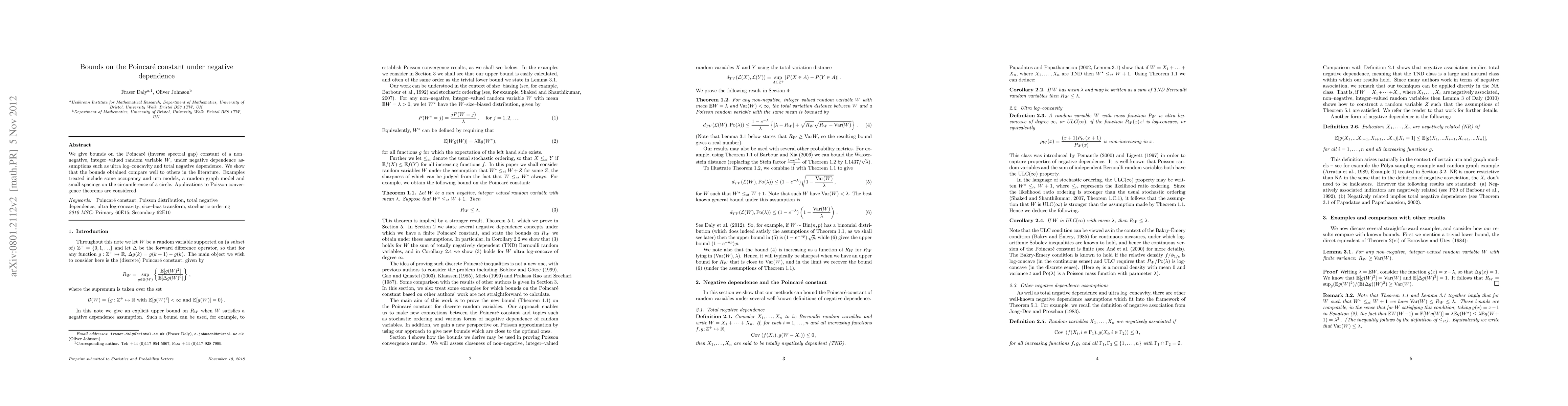 We give bounds on the Poincare (inverse spectral gap) constant of a non-negative, integer-valued random variable W, under negative dependence assumptions such as ultra log-concavity and total negative dependence. We show that the bounds obtained compare well to others in the literature. Examples treated include some occupancy and urn models, a random graph model and small spacings on the circumference of a circle. Applications to Poisson convergence theorems are considered.
