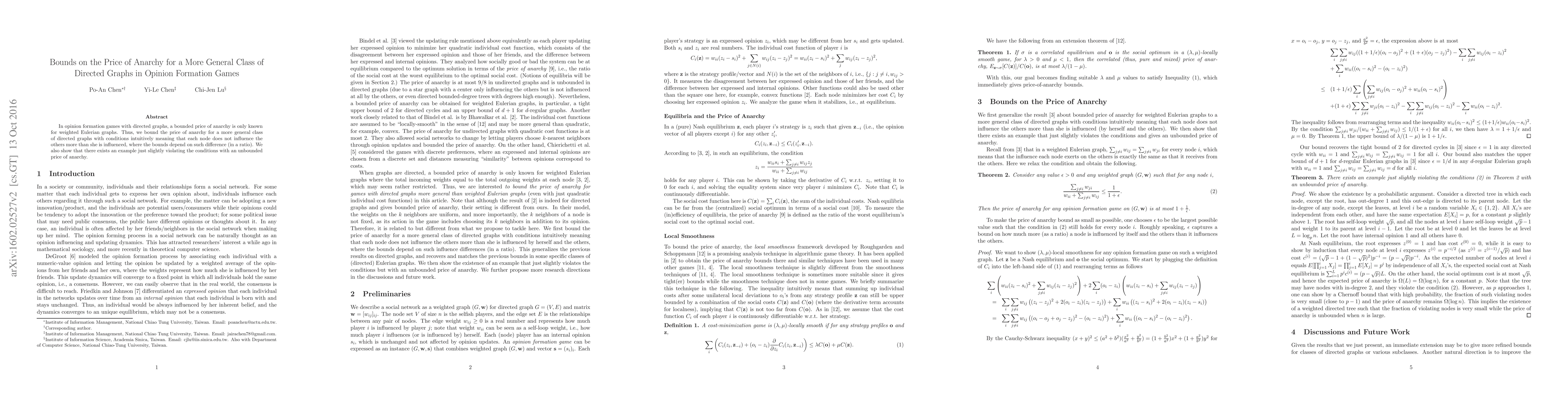 This paper establishes bounds on the price of anarchy for a broader class of directed graphs in opinion formation games, extending beyond weighted Eulerian graphs. It introduces conditions where each node's influence is limited by its own influence, and demonstrates that these bounds depend on the ratio of influence differences. The paper also presents an example where the conditions are nearly violated, leading to an unbounded price of anarchy.
