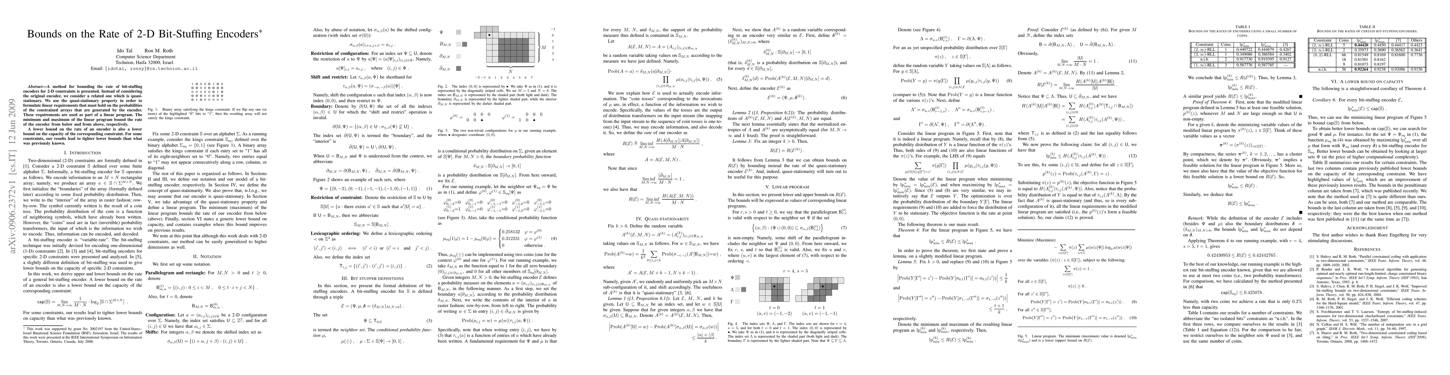 A method for bounding the rate of bit-stuffing encoders for 2-D constraints is presented. Instead of considering the original encoder, we consider a related one which is quasi-stationary. We use the quasi-stationary property in order to formulate linear requirements that must hold on the probabilities of the constrained arrays that are generated by the encoder. These requirements are used as part of a linear program. The minimum and maximum of the linear program bound the rate of the encoder from below and from above, respectively. A lower bound on the rate of an encoder is also a lower bound on the capacity of the corresponding constraint. For some constraints, our results lead to tighter lower bounds than what was previously known.