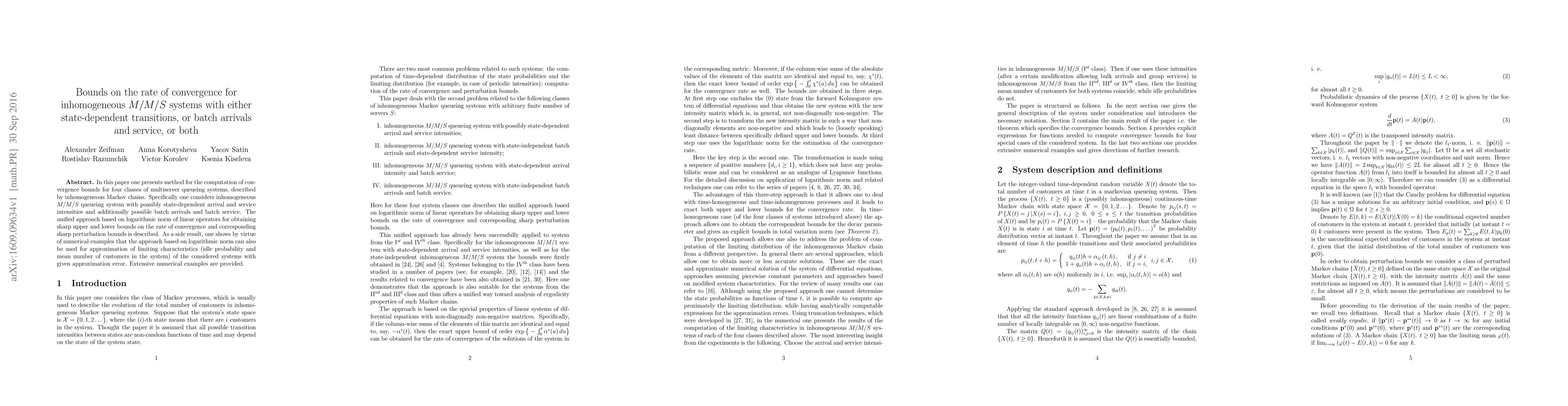 In this paper one presents method for the computation of convergence bounds for four classes of multiserver queueing systems, described by inhomogeneous Markov chains. Specifically one considers inhomogeneous $M/M/S$ queueing system with possibly state-dependent arrival and service intensities and additionally possible batch arrivals and batch service. The unified approach based on logarithmic norm of linear operators for obtaining sharp upper and lower bounds on the rate of convergence and corresponding sharp perturbation bounds is described. As a side result, one shows by virtue of numerical examples that the approach based on logarithmic norm can also be used for approximation of limiting characteristics (idle probability and mean number of customers in the system) of the considered systems with given approximation error. Extensive numerical examples are provided.