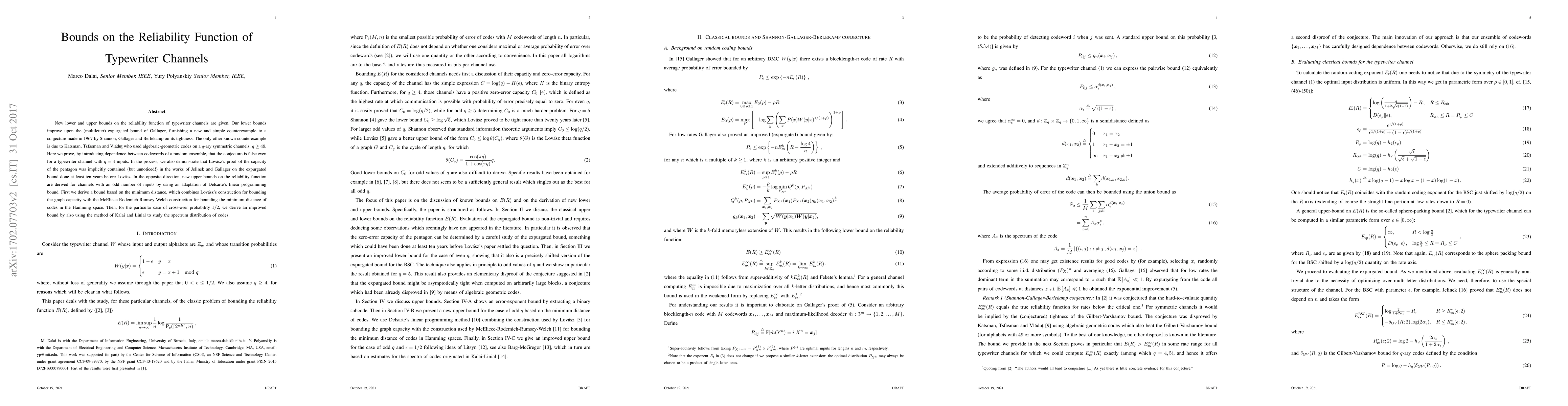 New lower and upper bounds on the reliability function of typewriter channels are given. Our lower bounds improve upon the (multiletter) expurgated bound of Gallager, furnishing a new and simple counterexample to a conjecture made in 1967 by Shannon, Gallager and Berlekamp on its tightness. The only other known counterexample is due to Katsman, Tsfasman and Vl\u{a}du\c{t} who used algebraic-geometric codes on a $q$-ary symmetric channels, $q\geq 49$. Here we prove, by introducing dependence between codewords of a random ensemble, that the conjecture is false even for a typewriter channel with $q=4$ inputs. In the process, we also demonstrate that Lov\'asz's proof of the capacity of the pentagon was implicitly contained (but unnoticed!) in the works of Jelinek and Gallager on the expurgated bound done at least ten years before Lov\'asz. In the opposite direction, new upper bounds on the reliability function are derived for channels with an odd number of inputs by using an adaptation of Delsarte's linear programming bound. First we derive a bound based on the minimum distance, which combines Lov\'asz's construction for bounding the graph capacity with the McEliece-Rodemich-Rumsey-Welch construction for bounding the minimum distance of codes in the Hamming space. Then, for the particular case of cross-over probability $1/2$, we derive an improved bound by also using the method of Kalai and Linial to study the spectrum distribution of codes.