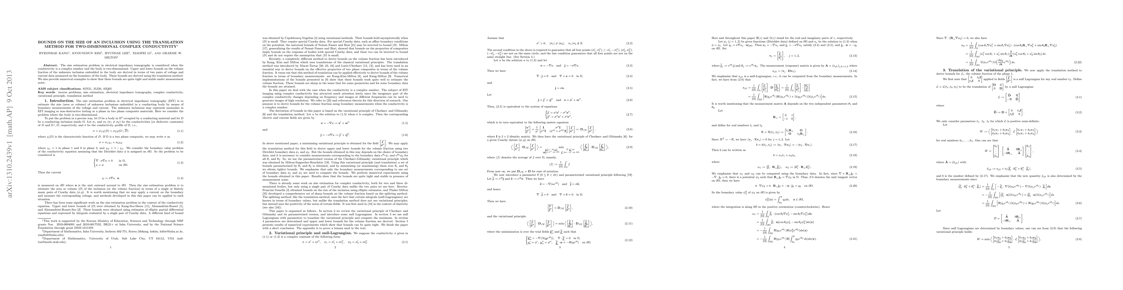 The size estimation problem in electrical impedance tomography is considered when the conductivity is a complex number and the body is two-dimensional. Upper and lower bounds on the volume fraction of the unknown inclusion embedded in the body are derived in terms of two pairs of voltage and current data measured on the boundary of the body. These bounds are derived using the translation method. We also provide numerical examples to show that these bounds are quite tight and stable under measurement noise.