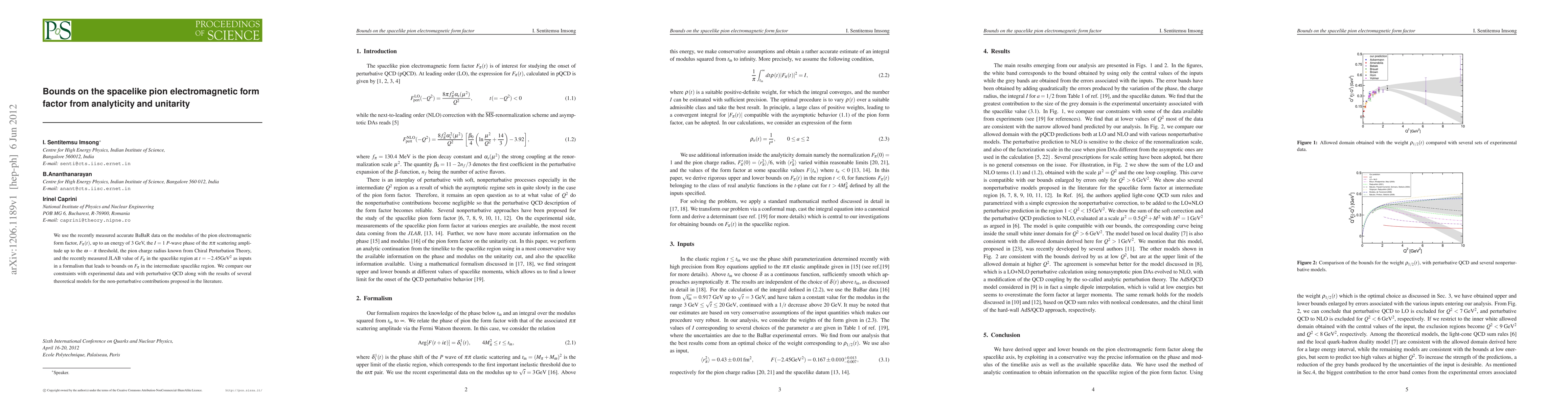 We use the recently measured accurate BaBaR data on the modulus of the pion electromagnetic form factor, $F_\pi(t)$, up to an energy of 3 GeV, the I=1 $P$-wave phase of the $\pi\pi$ scattering amplitude up to the $\omega-\pi$ threshold, the pion charge radius known from Chiral Perturbation Theory, and the recently measured JLAB value of $F_\pi$ in the spacelike region at $t=-2.45 {\rm GeV}^2$ as inputs in a formalism that leads to bounds on $F_\pi$ in the intermediate spacelike region. We compare our constraints with experimental data and with perturbative QCD along with the results of several theoretical models for the non-perturbative contributions proposed in the literature.