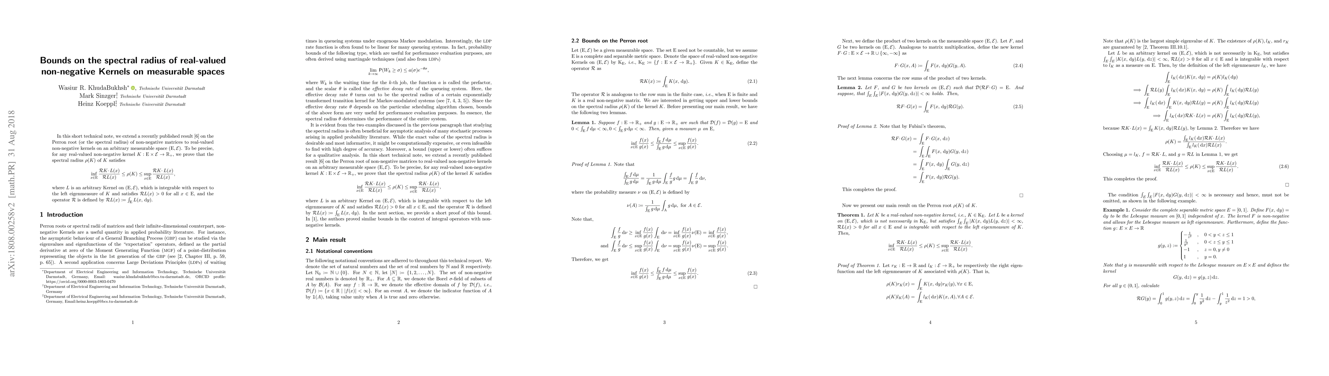 In this short technical note, we extend a recently published result [Liao2017] on the Perron root (or the spectral radius) of non-negative matrices to real-valued non-negative kernels on an arbitrary measurable space $(\mathrm{E}, \mathcal{E})$. To be precise, for any real-valued non-negative kernel $K : \mathrm{E}\times \mathcal{E} \rightarrow \mathbb{R}$, we prove that the spectral radius $\rho(K)$ of $K$ satisfies $$ \inf_{x \in \mathrm{E} } \frac{ \mathcal{R} K \cdotp L (x) }{ \mathcal{R} L (x) } \le \rho(K) \le \sup_{x \in \mathrm{E} } \frac{ \mathcal{R} K\cdotp L (x) }{ \mathcal{R} L (x) }, $$ where $L$ is an arbitrary Kernel on $(\mathrm{E}, \mathcal{E})$, which is integrable with respect to the left eigenmeasure of $K$ and satisfies $ \mathcal{R} L (x) >0 $ for all $x \in \mathrm{E}$, and the operator $\mathcal{R}$ is defined by $\mathcal{R}L (x) :=\int_{\mathrm{E}} L(x, \mathrm{d}y) $.
