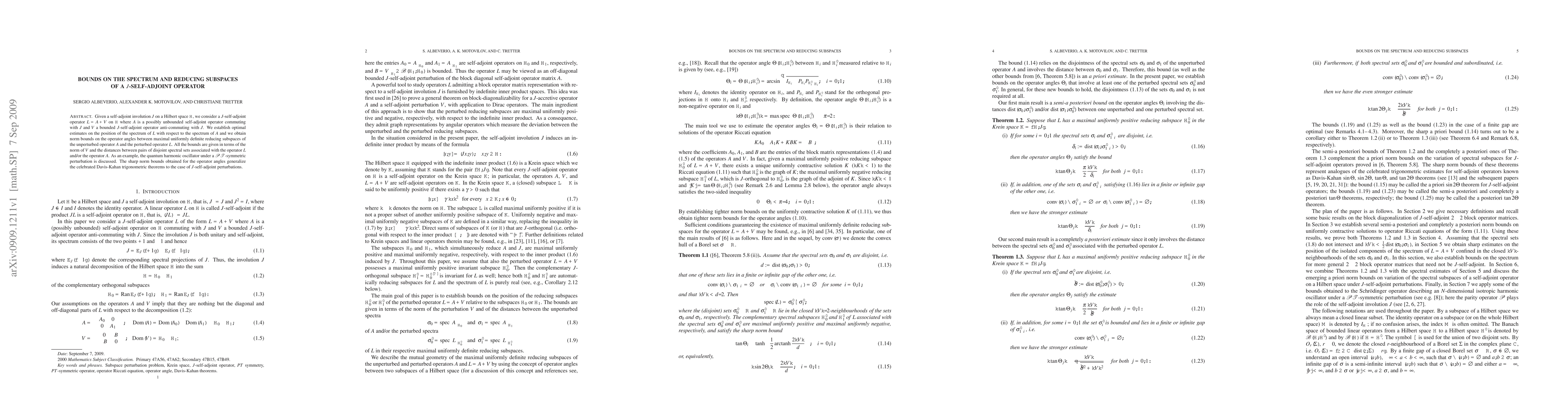 Given a self-adjoint involution J on a Hilbert space H, we consider a J-self-adjoint operator L=A+V on H where A is a possibly unbounded self-adjoint operator commuting with J and V a bounded J-self-adjoint operator anti-commuting with J. We establish optimal estimates on the position of the spectrum of L with respect to the spectrum of A and we obtain norm bounds on the operator angles between maximal uniformly definite reducing subspaces of the unperturbed operator A and the perturbed operator L. All the bounds are given in terms of the norm of V and the distances between pairs of disjoint spectral sets associated with the operator L and/or the operator A. As an example, the quantum harmonic oscillator under a PT-symmetric perturbation is discussed. The sharp norm bounds obtained for the operator angles generalize the celebrated Davis-Kahan trigonometric theorems to the case of J-self-adjoint perturbations.