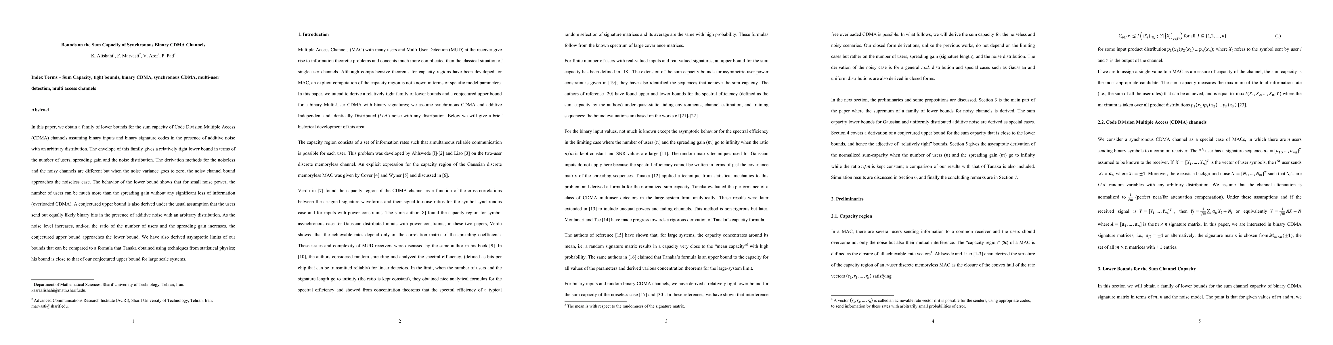 Researchers derived bounds on the sum capacity of CDMA channels with lower and upper limits that depend on the number of users, spreading gain, and noise level. These findings suggest that for small noise power, many users can be supported without significant loss of information in overloaded CDMA systems.