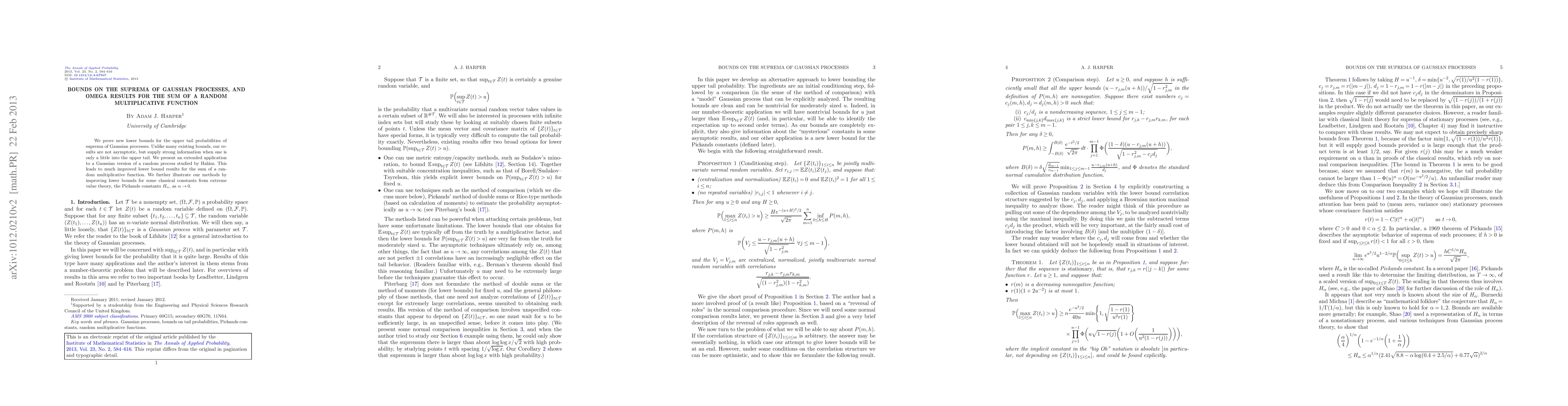 Researchers establish new bounds for the upper tail probabilities of Gaussian processes, leading to improved lower bound results for the sum of random multiplicative functions, with implications for extreme value theory.
