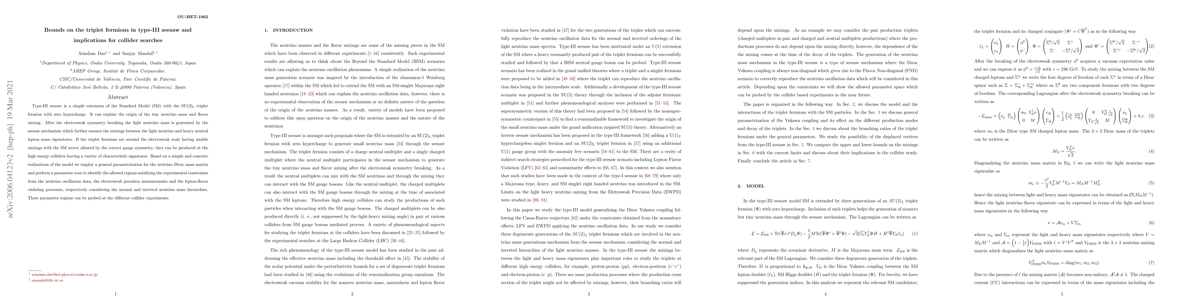 Type-III seesaw is a simple extension of the Standard Model~(SM) with the SU$(2)_\text{L}$ triplet fermion with zero hypercharge. It can explain the origin of the tiny neutrino mass and flavor mixing. After the electroweak symmetry breaking the light neutrino mass is generated by the seesaw mechanism which further ensures the mixings between the light neutrino and heavy neutral lepton mass eigenstates. If the triplet fermions are around the electroweak scale having sizable mixings with the SM sector allowed by the correct gauge symmetry, they can be produced at the high energy colliders leaving a variety of characteristic signatures. Based on a simple and concrete realizations of the model we employ a general parametrization for the neutrino Dirac mass matrix and perform a parameter scan to identify the allowed regions satisfying the experimental constraints from the neutrino oscillation data, the electroweak precision measurements and the lepton-flavor violating processes, respectively considering the normal and inverted neutrino mass hierarchies. These parameter regions can be probed at the different collider experiments.