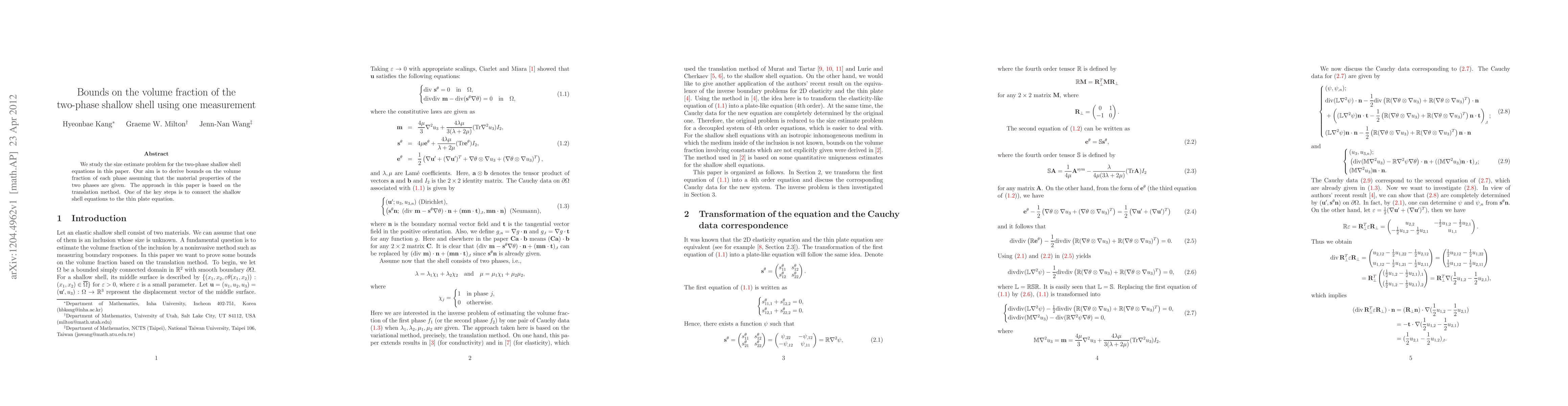 This paper investigates the estimation of the volume fraction in two-phase shallow shell equations using a single measurement. It employs the translation method, linking shallow shell equations to thin plate equations to derive bounds on the volume fraction of each phase given the material properties.
