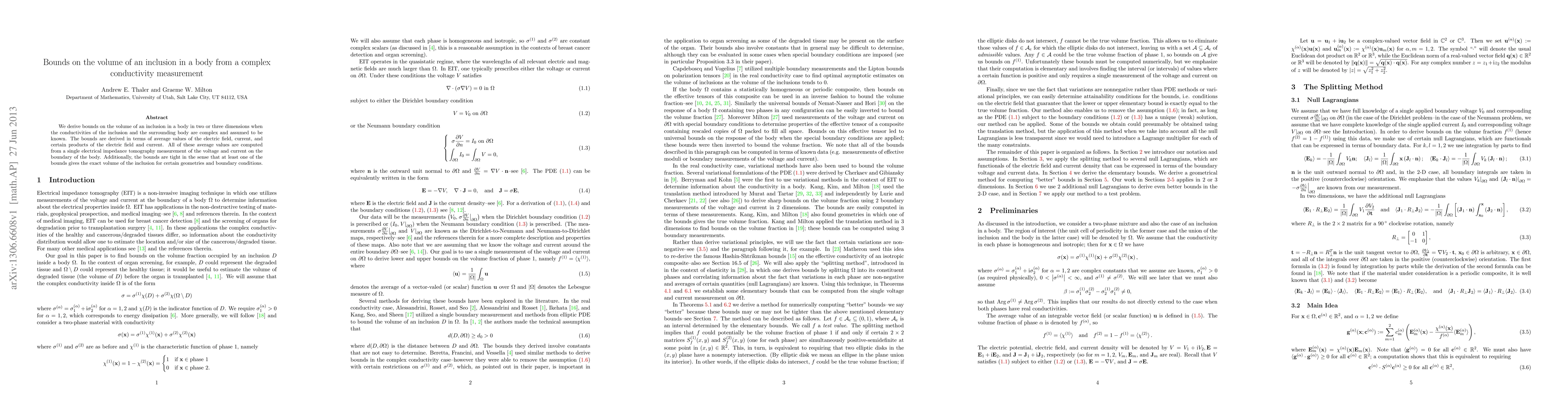We derive bounds on the volume of an inclusion in a body in two or three dimensions when the conductivities of the inclusion and the surrounding body are complex and assumed to be known. The bounds are derived in terms of average values of the electric field, current, and certain products of the electric field and current. All of these average values are computed from a single electrical impedance tomography measurement of the voltage and current on the boundary of the body. Additionally, the bounds are tight in the sense that at least one of the bounds gives the exact volume of the inclusion for certain geometries and boundary conditions.