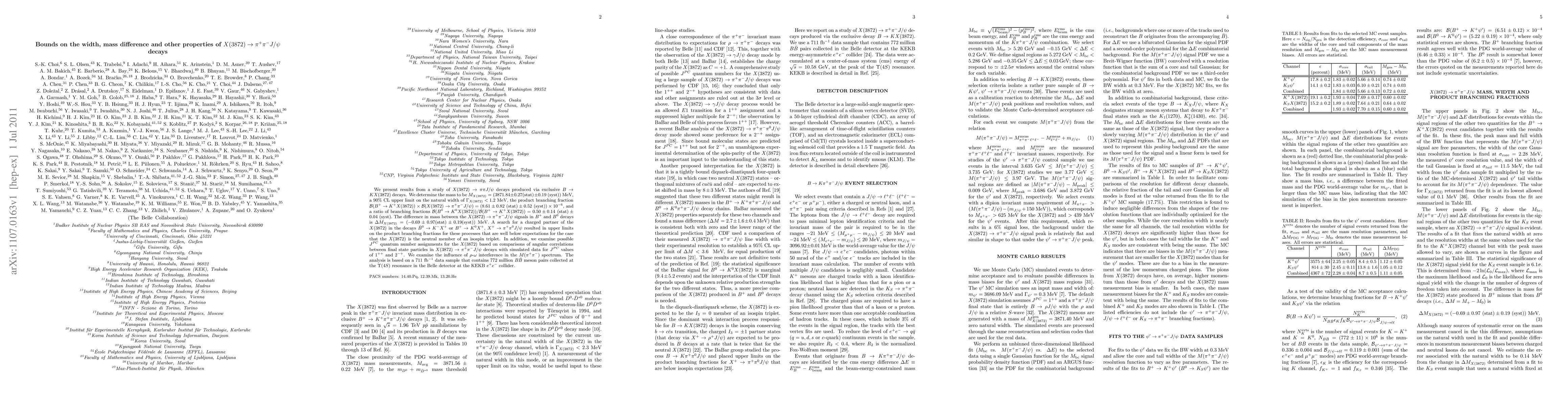 This study investigates the properties of X(3872) in its decay to pi+pi-J/psi, determining its mass and setting upper limits on its natural width and branching fractions. The analysis suggests no evidence for a charged partner of X(3872) and explores its possible quantum numbers.
