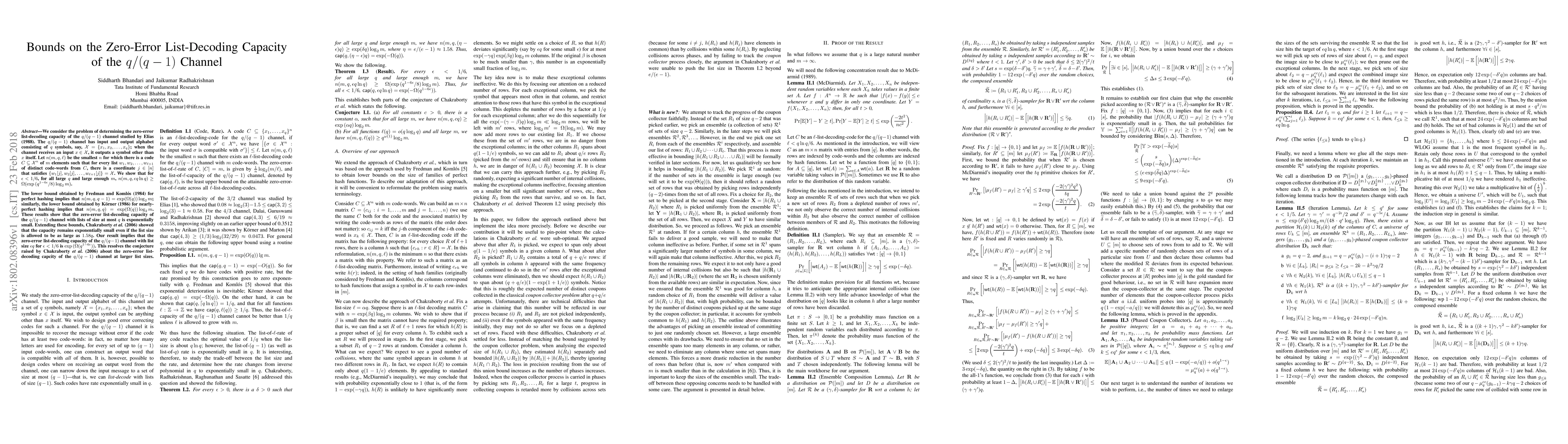 We consider the problem of determining the zero-error list-decoding capacity of the $q/(q-1)$ channel studied by Elias (1988). The $q/(q-1)$ channel has input and output alphabet consisting of $q$ symbols, say, $Q = \{x_1,x_2,\ldots, x_q\}$; when the channel receives an input $x \in Q$, it outputs a symbol other than $x$ itself. Let $n(m,q,\ell)$ be the smallest $n$ for which there is a code $C \subseteq Q^n$ of $m$ elements such that for every list $w_1, w_2, \ldots, w_{\ell+1}$ of distinct code-words from $C$, there is a coordinate $j \in [n]$ that satisfies $\{w_1[j], w_2[j], \ldots, w_{\ell+1}[j]\} = Q$. We show that for $\epsilon<1/6$, for all large $q$ and large enough $m$, $n(m,q, \epsilon q\ln{q}) \geq \Omega(\exp{(q^{1-6\epsilon}/8)}\log_2{m})$. The lower bound obtained by Fredman and Koml\'{o}s (1984) for perfect hashing implies that $n(m,q,q-1) = \exp(\Omega(q)) \log_2 m$; similarly, the lower bound obtained by K\"{o}rner (1986) for nearly-perfect hashing implies that $n(m,q,q) = \exp(\Omega(q)) \log_2 m$. These results show that the zero-error list-decoding capacity of the $q/(q-1)$ channel with lists of size at most $q$ is exponentially small. Extending these bounds, Chakraborty et al. (2006) showed that the capacity remains exponentially small even if the list size is allowed to be as large as $1.58q$. Our result implies that the zero-error list-decoding capacity of the $q/(q-1)$ channel with list size $\epsilon q$ for $\epsilon<1/6$ is $\exp{(\Omega(q^{1-6\epsilon}))}$. This resolves the conjecture raised by Chakraborty et al. (2006) about the zero-error list-decoding capcity of the $q/(q-1)$ channel at larger list sizes.