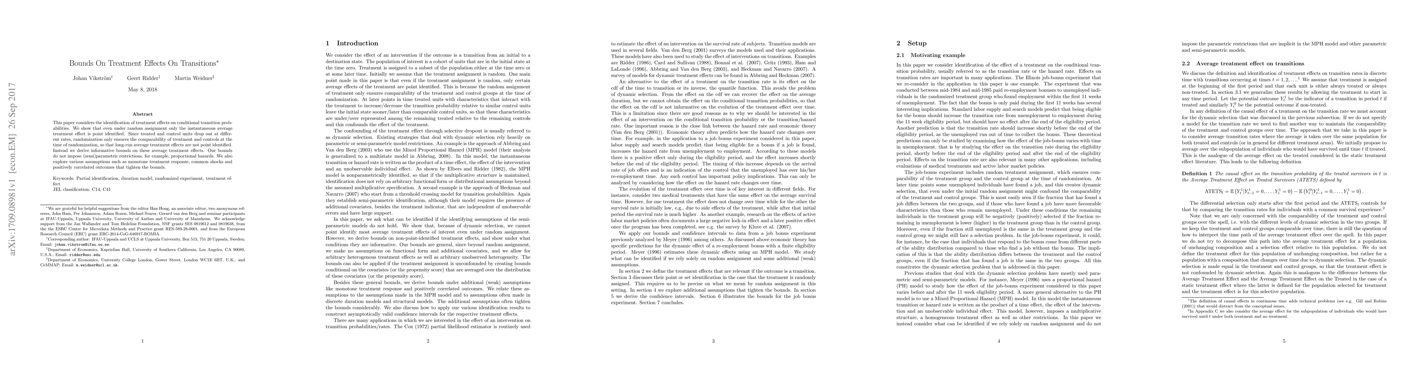 This paper considers the identification of treatment effects on conditional transition probabilities. We show that even under random assignment only the instantaneous average treatment effect is point identified. Since treated and control units drop out at different rates, randomization only ensures the comparability of treatment and controls at the time of randomization, so that long-run average treatment effects are not point identified. Instead we derive informative bounds on these average treatment effects. Our bounds do not impose (semi)parametric restrictions, for example, proportional hazards. We also explore various assumptions such as monotone treatment response, common shocks and positively correlated outcomes that tighten the bounds.