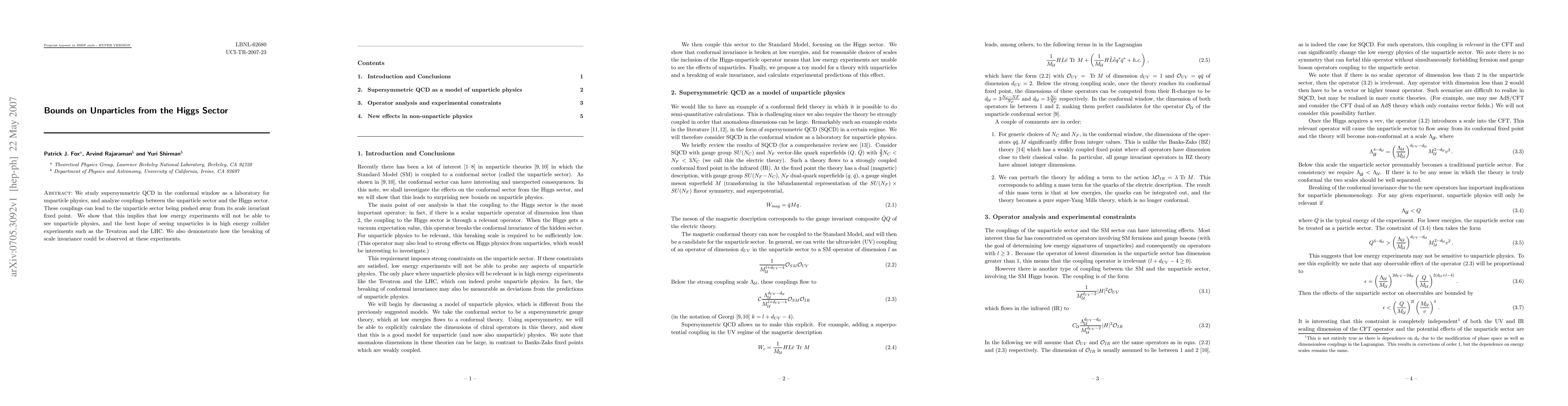 We study supersymmetric QCD in the conformal window as a laboratory for unparticle physics, and analyze couplings between the unparticle sector and the Higgs sector. These couplings can lead to the unparticle sector being pushed away from its scale invariant fixed point. We show that this implies that low energy experiments will not be able to see unparticle physics, and the best hope of seeing unparticles is in high energy collider experiments such as the Tevatron and the LHC. We also demonstrate how the breaking of scale invariance could be observed at these experiments.