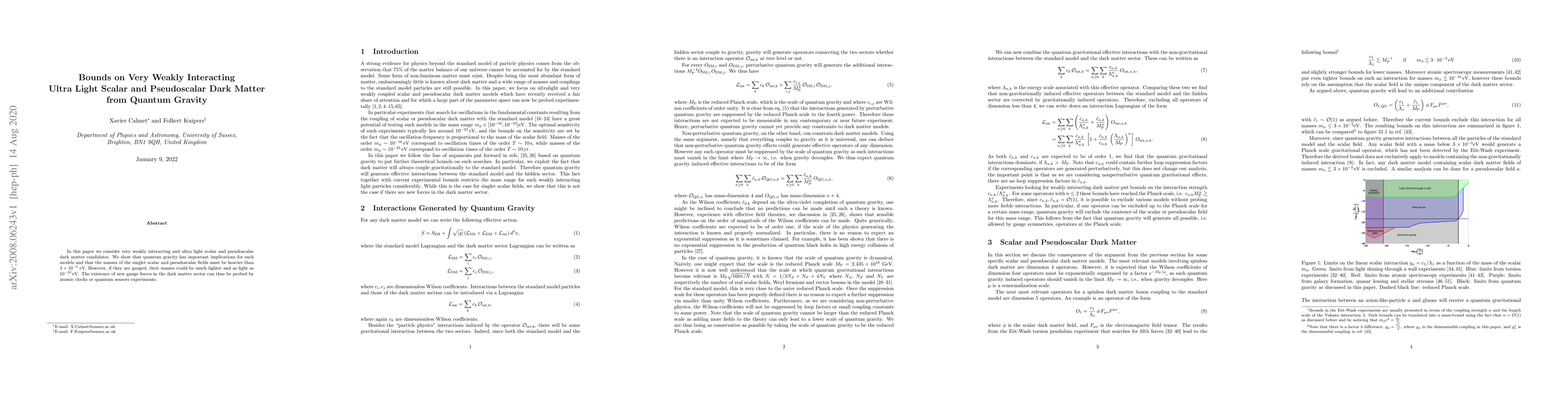 This paper investigates very weakly interacting ultra-light scalar and pseudoscalar dark matter candidates, demonstrating that quantum gravity constrains their masses to be heavier than $3\times 10^{-3}$ eV. However, if these fields are gauged, their masses could be as light as $10^{-22}$ eV, suggesting potential new gauge forces detectable via atomic clocks or quantum sensors.
