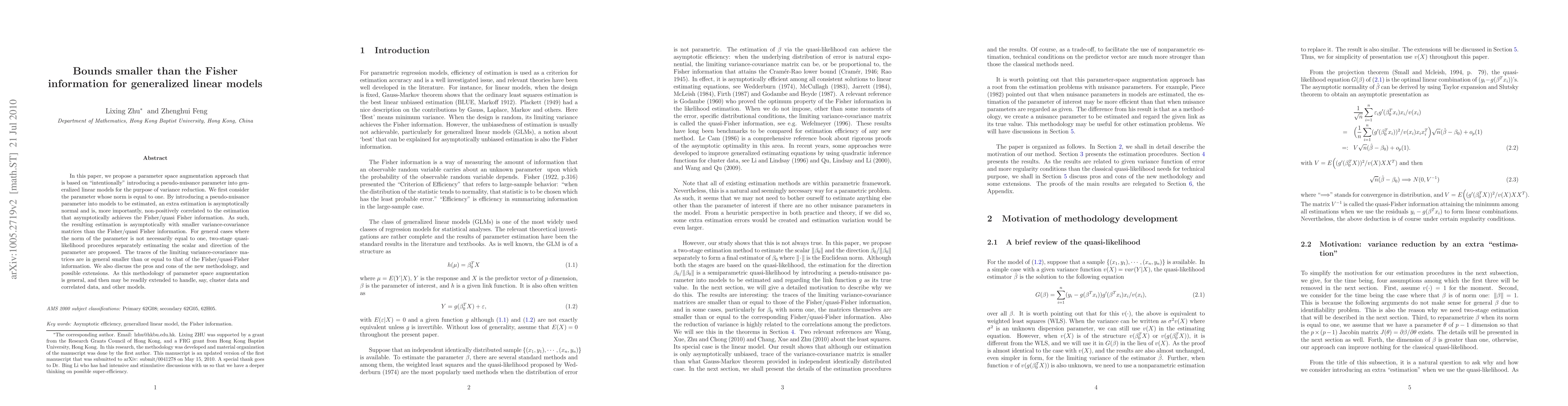 Researchers propose a new method to reduce variance in generalized linear models by introducing a pseudo-nuisance parameter, achieving bounds smaller than the Fisher information.