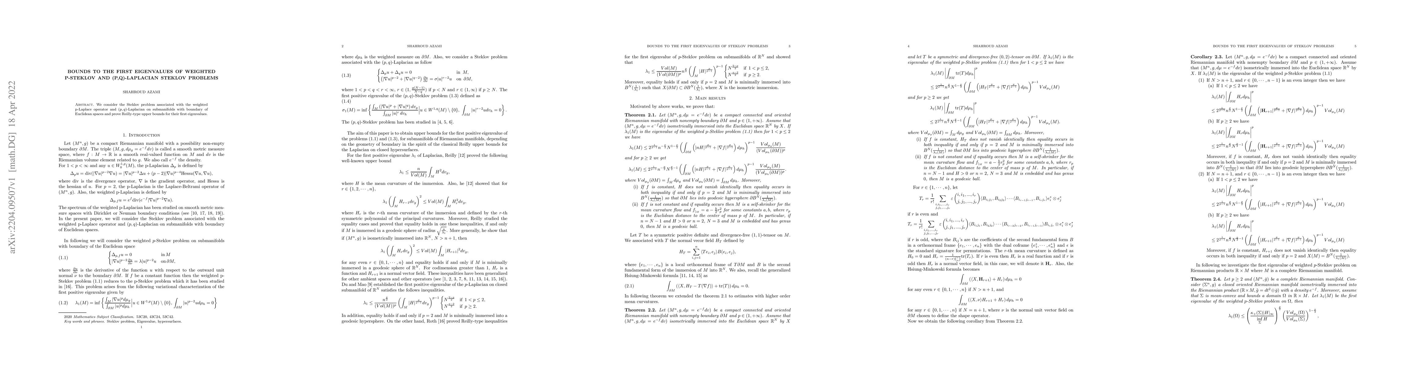Summary: This paper establishes Reilly-type upper bounds for the first eigenvalues of the weighted p-Steklov and (p,q)-Laplacian Steklov problems on submanifolds, leveraging the geometry of the boundary of Euclidean spaces. The results provide significant insights into the spectral properties of these operators.