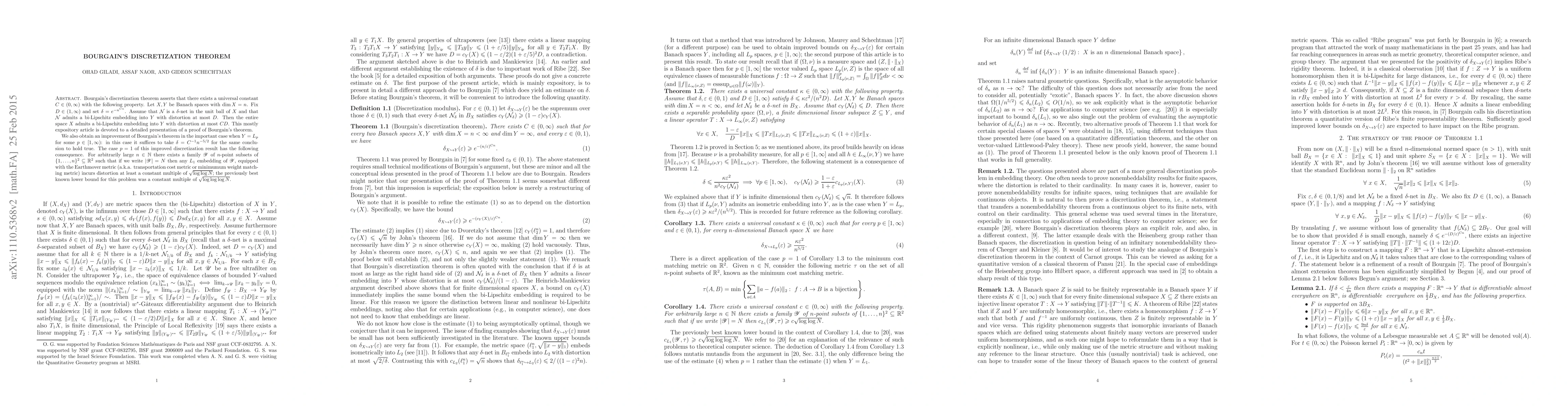 Bourgain's discretization theorem proves the existence of a universal constant $C$ such that any $\delta$-net in the unit ball of a finite-dimensional Banach space $X$ can be bi-Lipschitz embedded into $L_p$ with distortion at most $CD$, improving the original result for $p=1$ to $\sqrt{\log\log N}$ distortion.