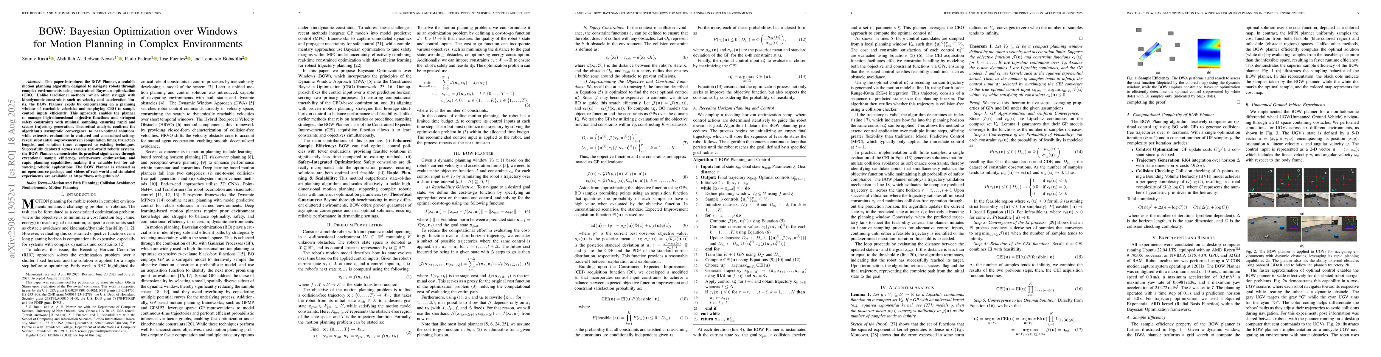 This paper introduces the BOW Planner, a scalable motion planning algorithm designed to navigate robots through complex environments using constrained Bayesian optimization (CBO). Unlike traditional methods, which often struggle with kinodynamic constraints such as velocity and acceleration limits, the BOW Planner excels by concentrating on a planning window of reachable velocities and employing CBO to sample control inputs efficiently. This approach enables the planner to manage high-dimensional objective functions and stringent safety constraints with minimal sampling, ensuring rapid and secure trajectory generation. Theoretical analysis confirms the algorithm's asymptotic convergence to near-optimal solutions, while extensive evaluations in cluttered and constrained settings reveal substantial improvements in computation times, trajectory lengths, and solution times compared to existing techniques. Successfully deployed across various real-world robotic systems, the BOW Planner demonstrates its practical significance through exceptional sample efficiency, safety-aware optimization, and rapid planning capabilities, making it a valuable tool for advancing robotic applications. The BOW Planner is released as an open-source package and videos of real-world and simulated experiments are available at https://bow-web.github.io.