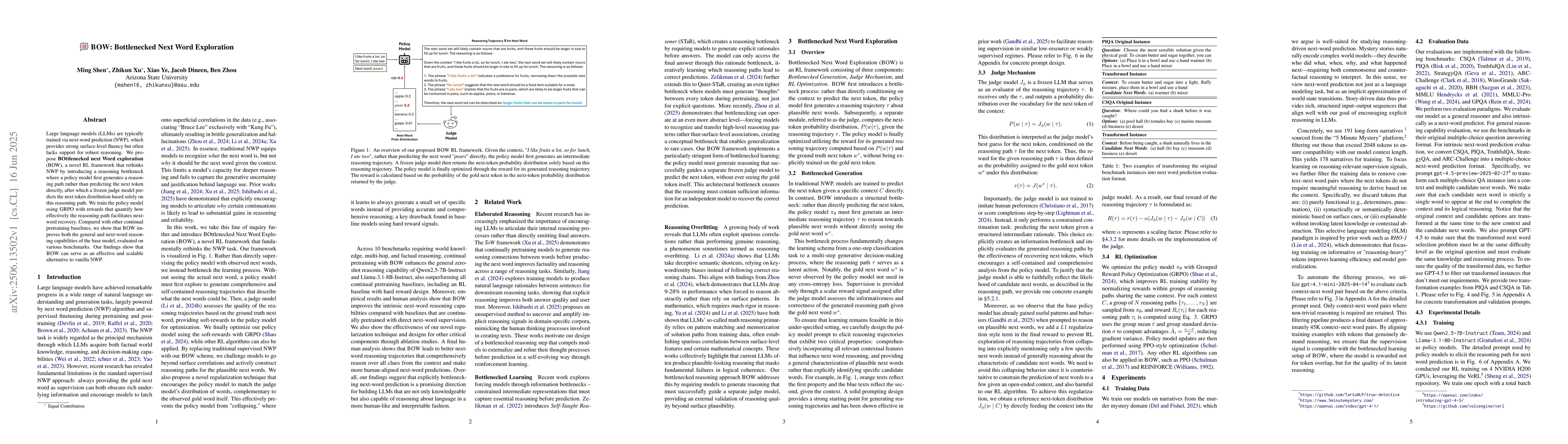 Large language models (LLMs) are typically trained via next-word prediction (NWP), which provides strong surface-level fluency but often lacks support for robust reasoning. We propose BOttlenecked next Word exploration (BOW), a novel RL framework that rethinks NWP by introducing a reasoning bottleneck where a policy model first generates a reasoning path rather than predicting the next token directly, after which a frozen judge model predicts the next token distribution based solely on this reasoning path. We train the policy model using GRPO with rewards that quantify how effectively the reasoning path facilitates next-word recovery. Compared with other continual pretraining baselines, we show that BOW improves both the general and next-word reasoning capabilities of the base model, evaluated on various benchmarks. Our findings show that BOW can serve as an effective and scalable alternative to vanilla NWP.