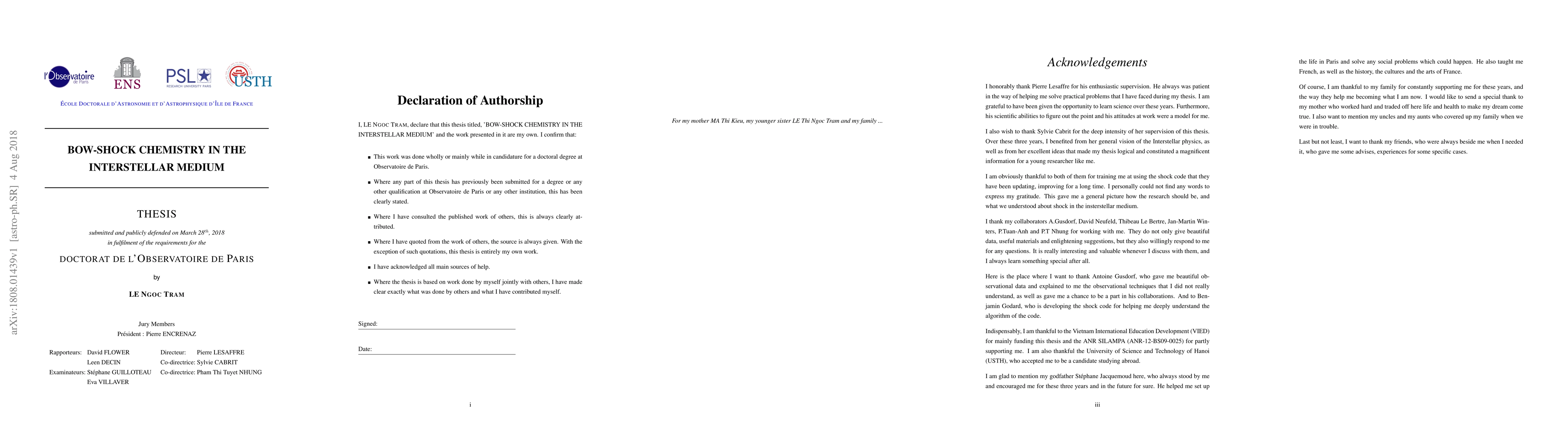 This paper investigates the chemistry and dynamics of bow shocks in the interstellar medium (ISM) generated by fast-moving stars, using the Paris-Durham planar shock code. It models 3D bow shocks and analyzes H2 excitation and emission profiles, improving interpretations of observations in Orion BN-KL and HH54. It also examines the conversion of hydrogen forms in the winds from AGB stars, suggesting molecular hydrogen may explain low HI abundances.