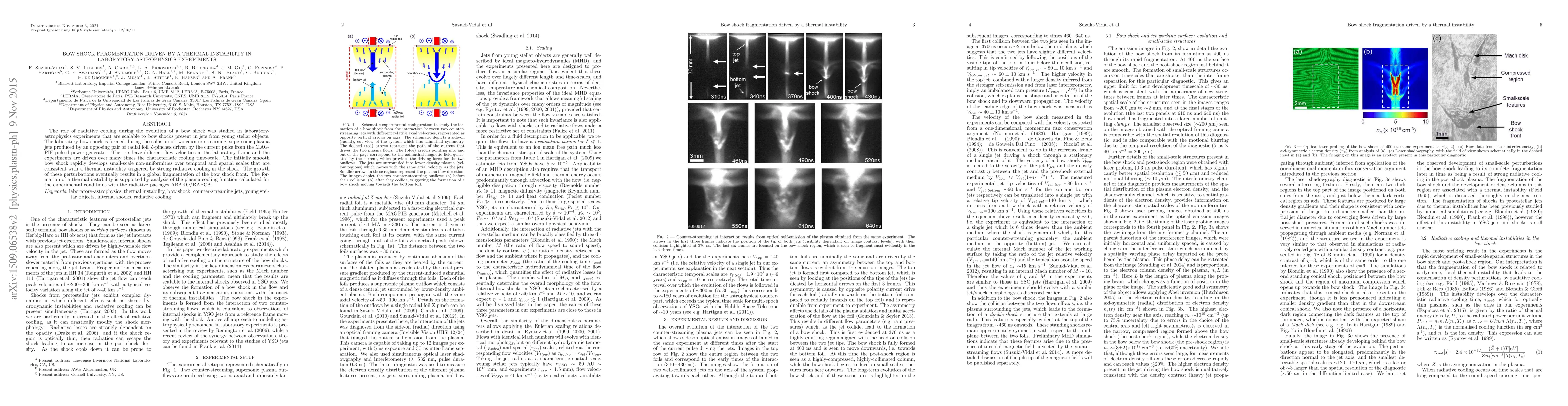 The role of radiative cooling during the evolution of a bow shock was studied in laboratory-astrophysics experiments that are scalable to bow shocks present in jets from young stellar objects. The laboratory bow shock is formed during the collision of two counter-streaming, supersonic plasma jets produced by an opposing pair of radial foil Z-pinches driven by the current pulse from the MAGPIE pulsed-power generator. The jets have different flow velocities in the laboratory frame and the experiments are driven over many times the characteristic cooling time-scale. The initially smooth bow shock rapidly develops small-scale non-uniformities over temporal and spatial scales that are consistent with a thermal instability triggered by strong radiative cooling in the shock. The growth of these perturbations eventually results in a global fragmentation of the bow shock front. The formation of a thermal instability is supported by analysis of the plasma cooling function calculated for the experimental conditions with the radiative packages ABAKO/RAPCAL.