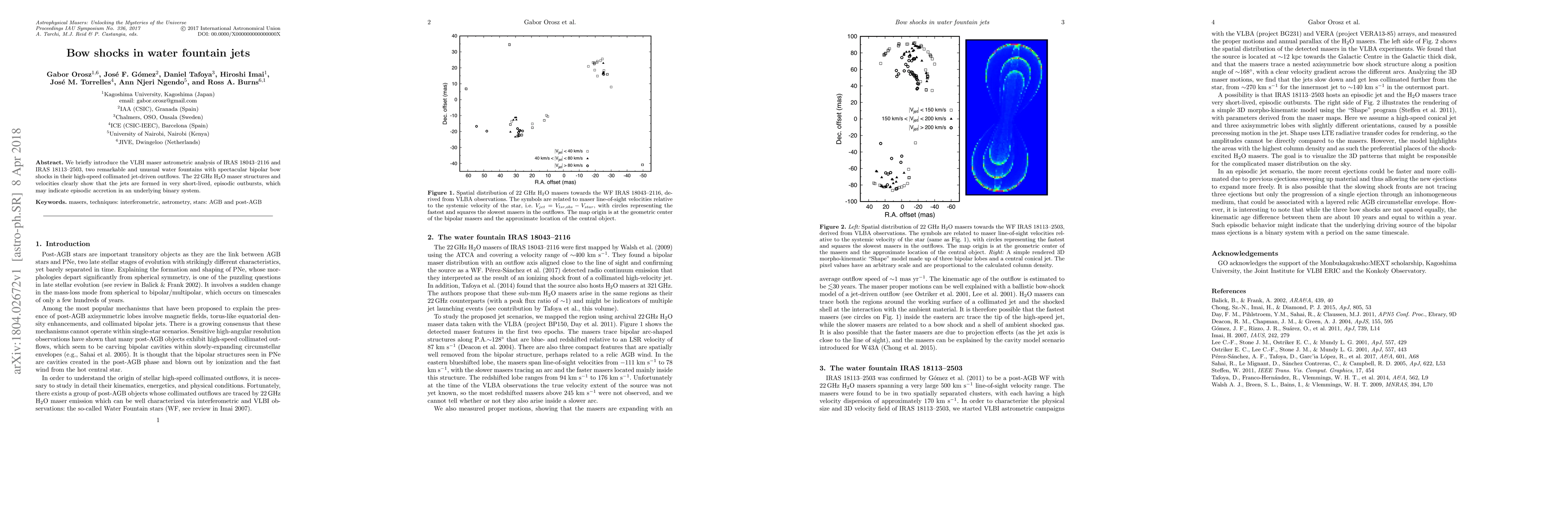 We briefly introduce the VLBI maser astrometric analysis of IRAS 18043-2116 and IRAS 18113-2503, two remarkable and unusual water fountains with spectacular bipolar bow shocks in their high-speed collimated jet-driven outflows. The 22 GHz H2O maser structures and velocities clearly show that the jets are formed in very short-lived, episodic outbursts, which may indicate episodic accretion in an underlying binary system.