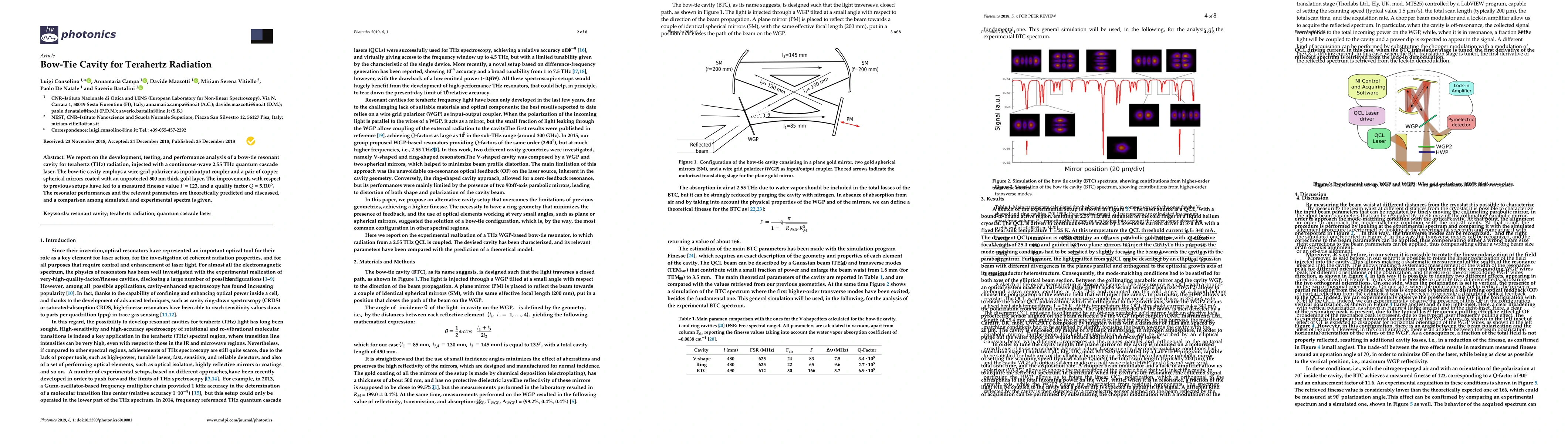 The research presents a bow-tie cavity for terahertz radiation, utilizing a continuous-wave 2.55 THz quantum cascade laser (QCL) for injection. The cavity employs gold mirrors and a free-standing wire-grid polarizer (WGP) as an input/output coupler.