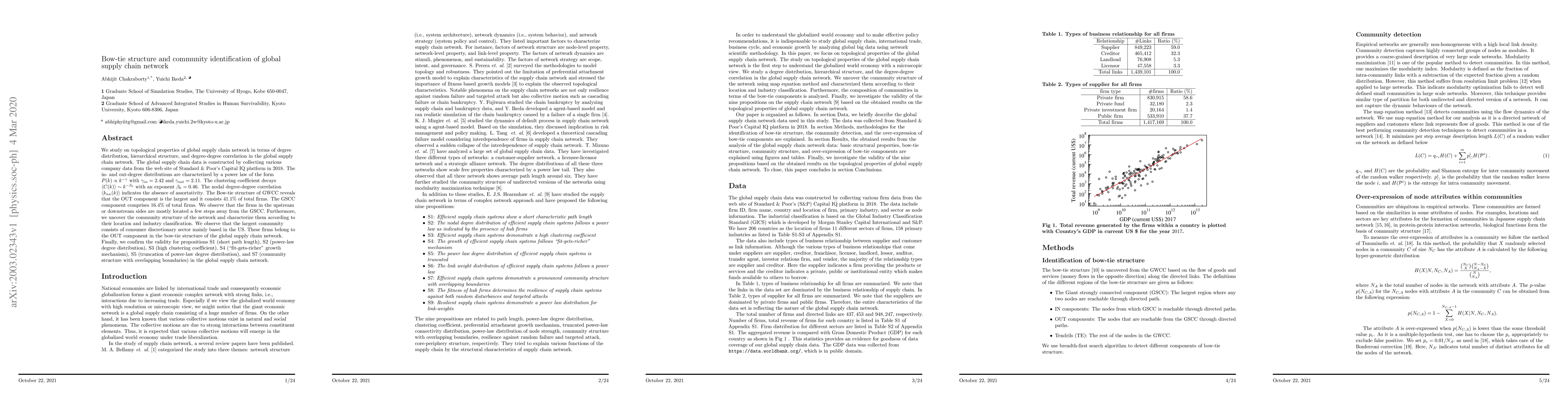 We study on topological properties of global supply chain network in terms of degree distribution, hierarchical structure, and degree-degree correlation in the global supply chain network. The global supply chain data is constructed by collecting various company data from the web site of Standard & Poor's Capital IQ platform in 2018. The in- and out-degree distributions are characterized by a power law with in-degree exponent = 2.42 and out-degree exponent = 2.11. The clustering coefficient decays as power law with an exponent = 0.46. The nodal degree-degree correlation indicates the absence of assortativity. The Bow-tie structure of GWCC reveals that the OUT component is the largest and it consists 41.1% of total firms. The GSCC component comprises 16.4% of total firms. We observe that the firms in the upstream or downstream sides are mostly located a few steps away from the GSCC. Furthermore, we uncover the community structure of the network and characterize them according to their location and industry classification. We observe that the largest community consists of consumer discretionary sector mainly based in the US. These firms belong to the OUT component in the bow-tie structure of the global supply chain network. Finally, we confirm the validity for propositions S1 (short path length), S2 (power-law degree distribution), S3 (high clustering coefficient), S4 ("fit-gets-richer" growth mechanism), S5 (truncation of power-law degree distribution), and S7 (community structure with overlapping boundaries) in the global supply chain network.