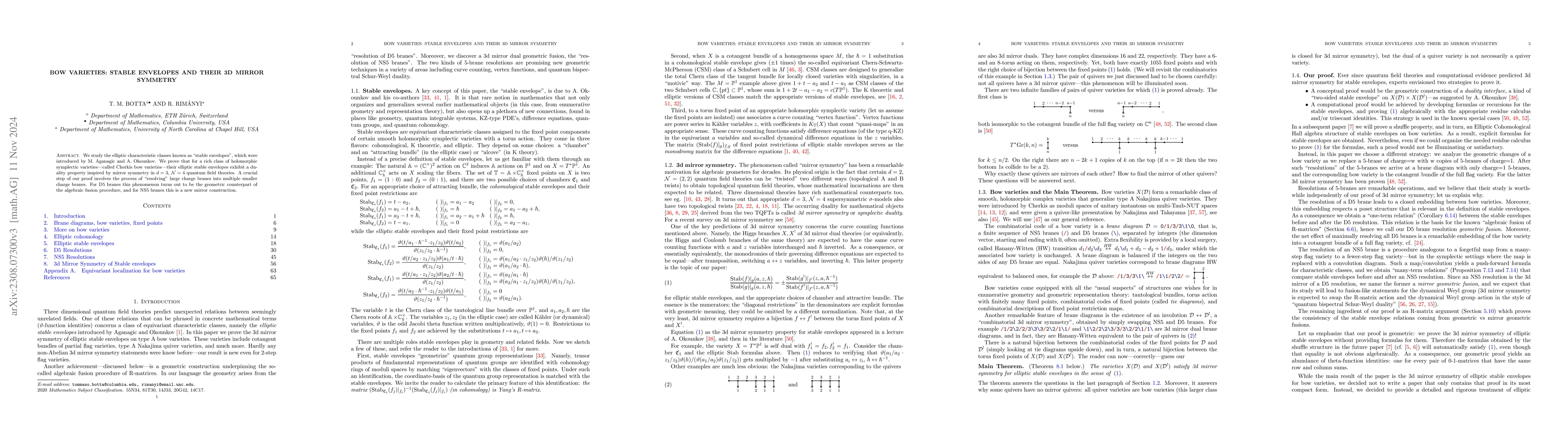 In this paper we study the elliptic characteristic classes known as ''stable envelopes'', which were introduced by M. Aganagic and A. Okounkov. We prove that for a rich class of holomorphic symplectic varieties$\unicode{x2013}$called Cherkis bow varieties$\unicode{x2013}$their elliptic stable envelopes exhibit a duality property inspired by mirror symmetry in $d=3$, $\mathcal N=4$ quantum field theories. A crucial step of our proof involves the process of ''resolving'' large charge branes into multiple smaller charge branes. This phenomenon turns out to be the geometric counterpart of the algebraic fusion procedure. Along the way we discover various new features in the geometry of bow varieties.