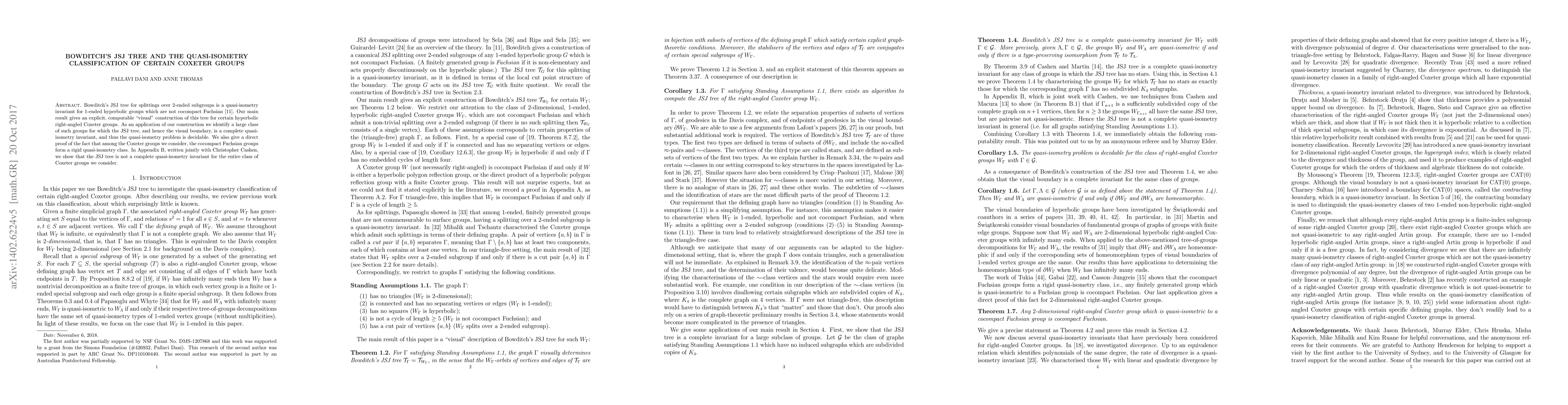 Bowditch's JSJ tree for splittings over 2-ended subgroups is a quasi-isometry invariant for 1-ended hyperbolic groups which are not cocompact Fuchsian. Our main result gives an explicit, computable "visual" construction of this tree for certain hyperbolic right-angled Coxeter groups. As an application of our construction we identify a large class of such groups for which the JSJ tree, and hence the visual boundary, is a complete quasi-isometry invariant, and thus the quasi-isometry problem is decidable. We also give a direct proof of the fact that among the Coxeter groups we consider, the cocompact Fuchsian groups form a rigid quasi-isometry class. In an appendix, written jointly with Christopher Cashen, we show that the JSJ tree is not a complete quasi-isometry invariant for the entire class of Coxeter groups we consider.