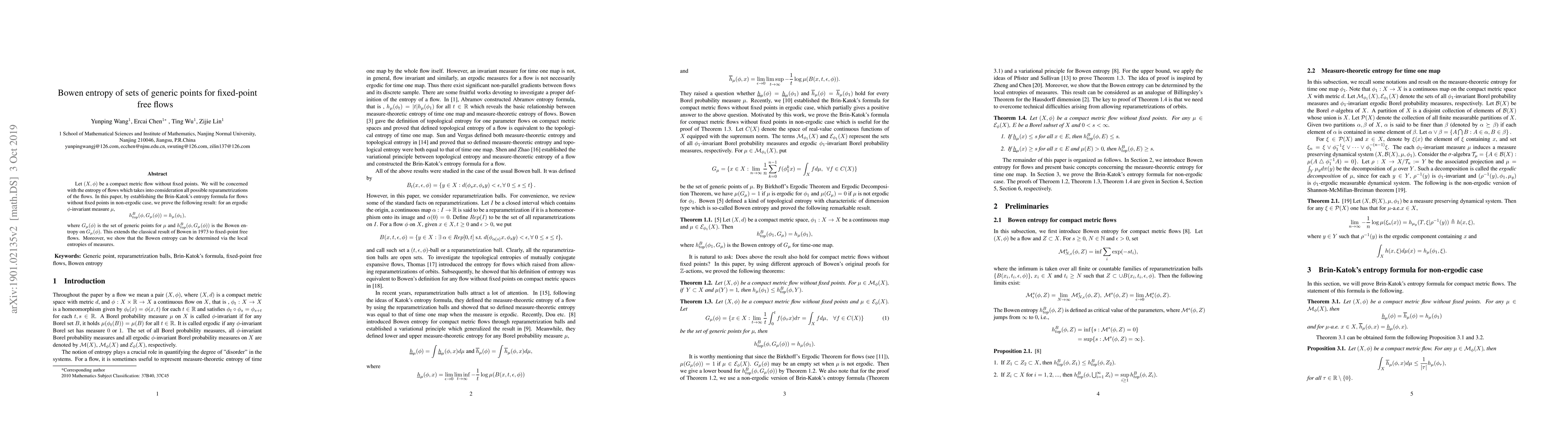 Let $(X, \phi)$ be a compact metric flow without fixed points. We will be concerned with the entropy of flows which takes into consideration all possible reparametrizations of the flows. In this paper, by establishing the Brin-Katok's entropy formula for flows without fixed points in non-ergodic case, we prove the following result: for an ergodic $\phi$-invariant measure $\mu$, $$ h_{top}^{B}(\phi, G_{\mu}(\phi))=h_{\mu}(\phi_{1}),$$ where $G_{\mu}(\phi)$ is the set of generic points for $\mu$ and $h_{top}^{B}(\phi, G_{\mu}(\phi))$ is the Bowen entropy on $G_{\mu}(\phi)$. This extends the classical result of Bowen in 1973 to fixed-point free flows. Moreover, we show that the Bowen entropy can be determined via the local entropies of measures.