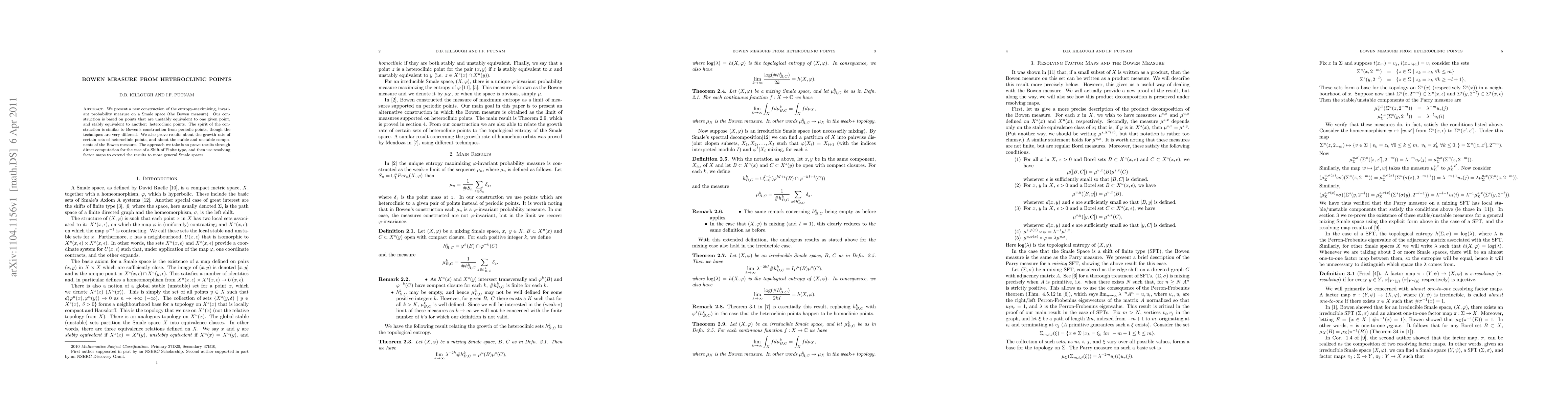 We present a new construction of the entropy-maximizing, invariant probability measure on a Smale space (the Bowen measure). Our construction is based on points that are unstably equivalent to one given point, and stably equivalent to another: heteroclinic points. The spirit of the construction is similar to Bowen's construction from periodic points, though the techniques are very different. We also prove results about the growth rate of certain sets of heteroclinic points, and about the stable and unstable components of the Bowen measure. The approach we take is to prove results through direct computation for the case of a Shift of Finite type, and then use resolving factor maps to extend the results to more general Smale spaces.