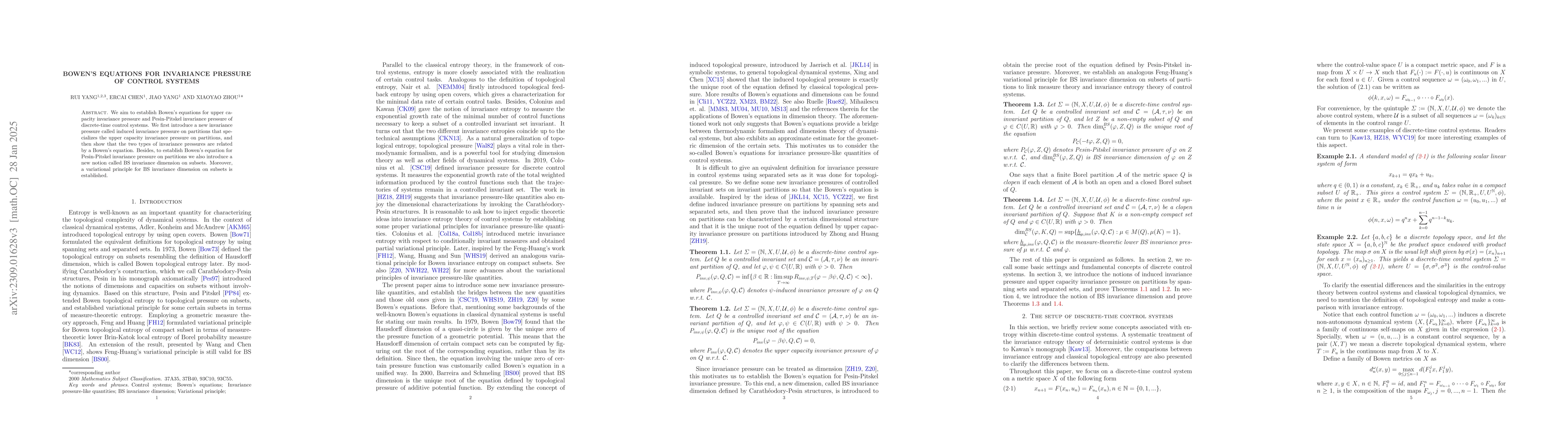 This paper establishes Bowen's equations for upper capacity invariance pressure and Pesin-Pitskel invariance pressure in discrete-time control systems, introducing a new induced invariance pressure and a BS invariance dimension, along with a variational principle for the latter.