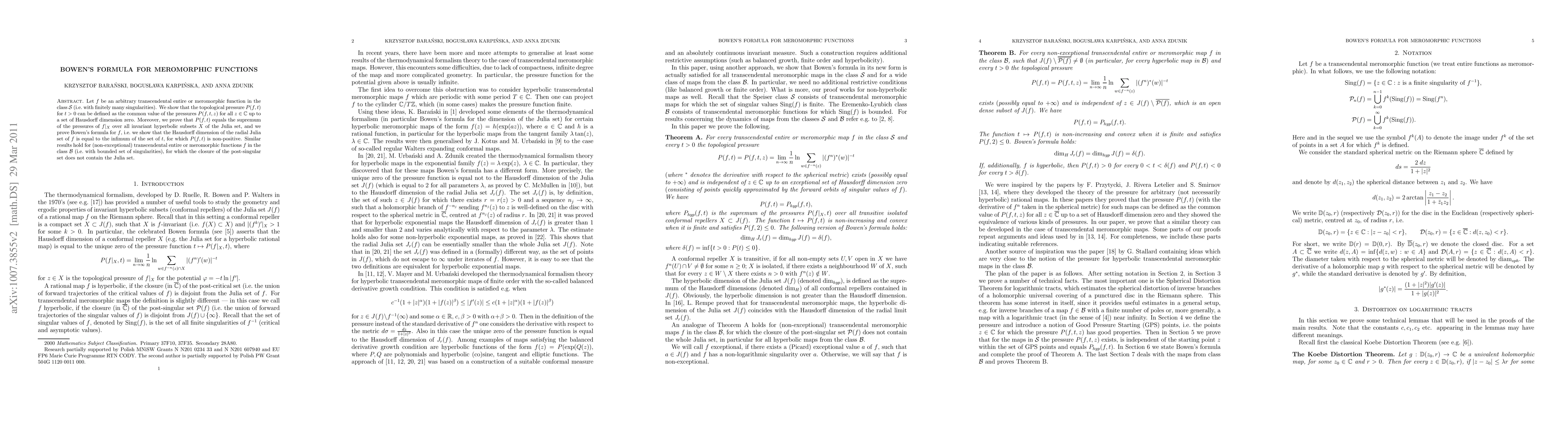 Let $f$ be an arbitrary transcendental entire or meromorphic function in the class $\mathcal S$ (i.e. with finitely many singularities). We show that the topological pressure $P(f,t)$ for $t > 0$ can be defined as the common value of the pressures $P(f,t, z)$ for all $z \in \mathbb C$ up to a set of Hausdorff dimension zero. Moreover, we prove that $P(f,t)$ equals the supremum of the pressures of $f|_X$ over all invariant hyperbolic subsets $X$ of the Julia set, and we prove Bowen's formula for $f$, i.e. we show that the Hausdorff dimension of the radial Julia set of $f$ is equal to the infimum of the set of $t$, for which $P(f,t)$ is non-positive. Similar results hold for (non-exceptional) transcendental entire or meromorphic functions $f$ in the class $\mathcal B$ (i.e. with bounded set of singularities), for which the closure of the post-singular set does not contain the Julia set.