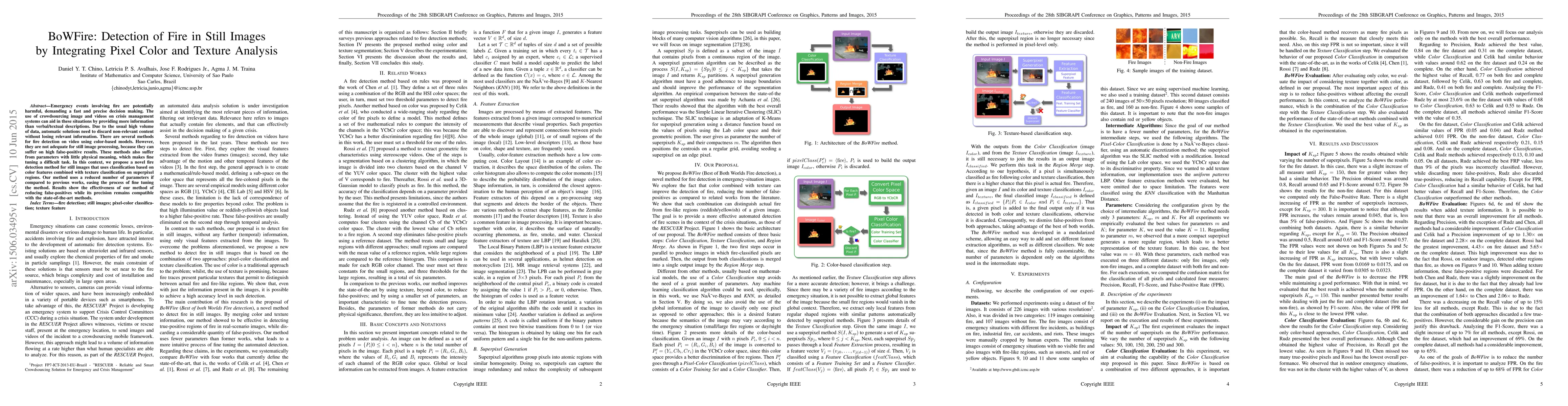 The paper proposes BoWFire, a novel fire detection method for still images that integrates pixel color and texture analysis to reduce false positives. The method combines color features with texture classification on superpixel regions, using fewer parameters for easier fine-tuning and achieving precision comparable to state-of-the-art methods.
