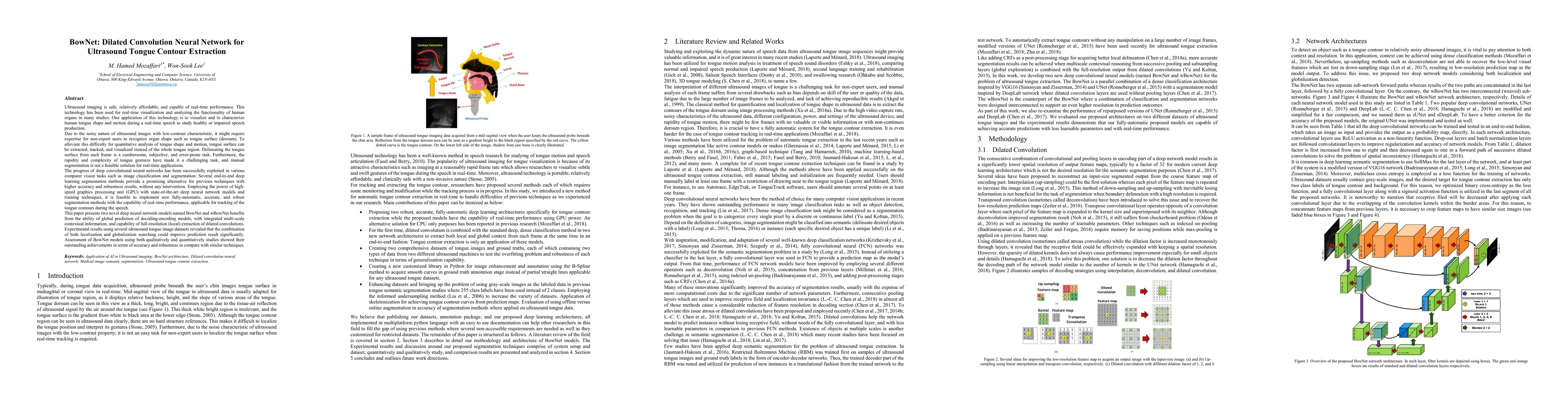 Ultrasound imaging is safe, relatively affordable, and capable of real-time performance. One application of this technology is to visualize and to characterize human tongue shape and motion during a real-time speech to study healthy or impaired speech production. Due to the noisy nature of ultrasound images with low-contrast characteristic, it might require expertise for non-expert users to recognize organ shape such as tongue surface (dorsum). To alleviate this difficulty for quantitative analysis of tongue shape and motion, tongue surface can be extracted, tracked, and visualized instead of the whole tongue region. Delineating the tongue surface from each frame is a cumbersome, subjective, and error-prone task. Furthermore, the rapidity and complexity of tongue gestures have made it a challenging task, and manual segmentation is not a feasible solution for real-time applications. Employing the power of state-of-the-art deep neural network models and training techniques, it is feasible to implement new fully-automatic, accurate, and robust segmentation methods with the capability of real-time performance, applicable for tracking of the tongue contours during the speech. This paper presents two novel deep neural network models named BowNet and wBowNet benefits from the ability of global prediction of decoding-encoding models, with integrated multi-scale contextual information, and capability of full-resolution (local) extraction of dilated convolutions. Experimental results using several ultrasound tongue image datasets revealed that the combination of both localization and globalization searching could improve prediction result significantly. Assessment of BowNet models using both qualitatively and quantitatively studies showed them outstanding achievements in terms of accuracy and robustness in comparison with similar techniques.