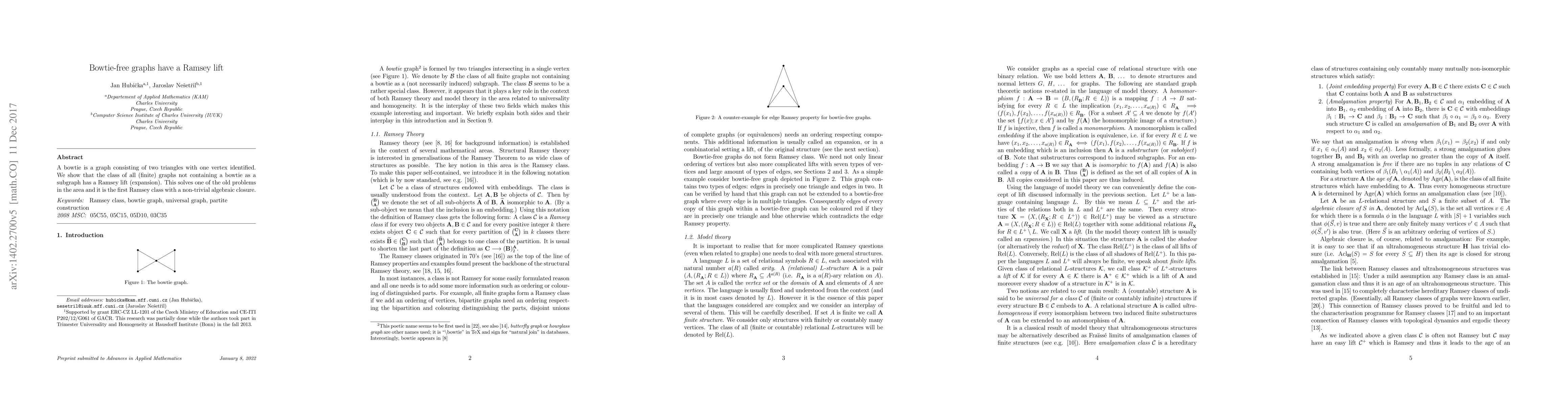 Summary: This paper demonstrates that graphs without a bowtie subgraph possess a Ramsey lift, resolving an old problem and marking the first non-trivial Ramsey class with a non-trivial algebraic closure.