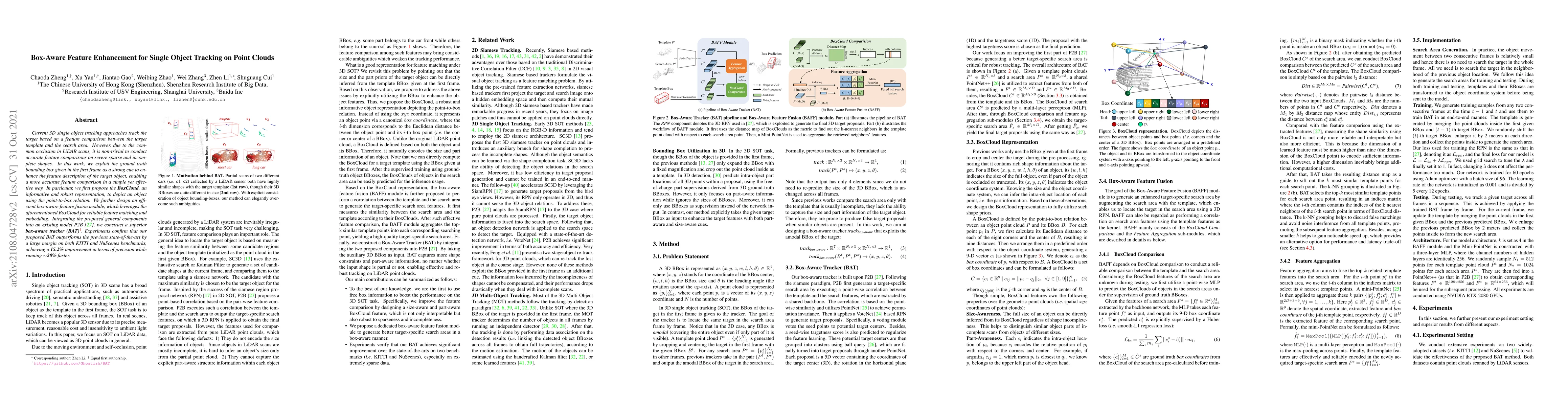 This paper proposes a box-aware feature enhancement method for 3D single object tracking on point clouds, utilizing the initial bounding box to improve feature description. The BoxCloud representation and box-aware feature fusion module enable more accurate tracking, resulting in a superior tracker that outperforms previous methods by 15.2% in precision on KITTI and NuScenes benchmarks.