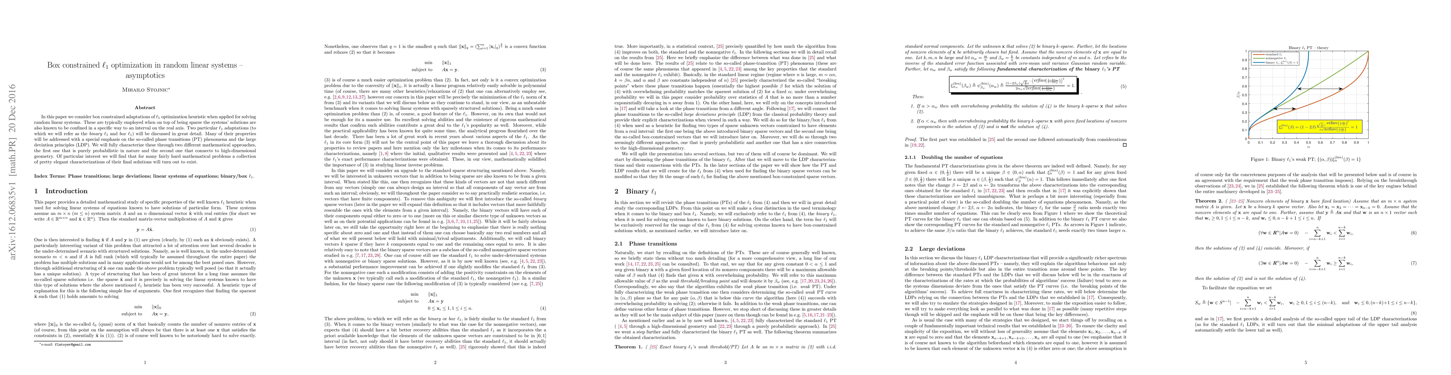 In this paper we consider box constrained adaptations of $\ell_1$ optimization heuristic when applied for solving random linear systems. These are typically employed when on top of being sparse the systems' solutions are also known to be confined in a specific way to an interval on the real axis. Two particular $\ell_1$ adaptations (to which we will refer as the \emph{binary} $\ell_1$ and \emph{box} $\ell_1$) will be discussed in great detail. Many of their properties will be addressed with a special emphasis on the so-called phase transitions (PT) phenomena and the large deviation principles (LDP). We will fully characterize these through two different mathematical approaches, the first one that is purely probabilistic in nature and the second one that connects to high-dimensional geometry. Of particular interest we will find that for many fairly hard mathematical problems a collection of pretty elegant characterizations of their final solutions will turn out to exist.
