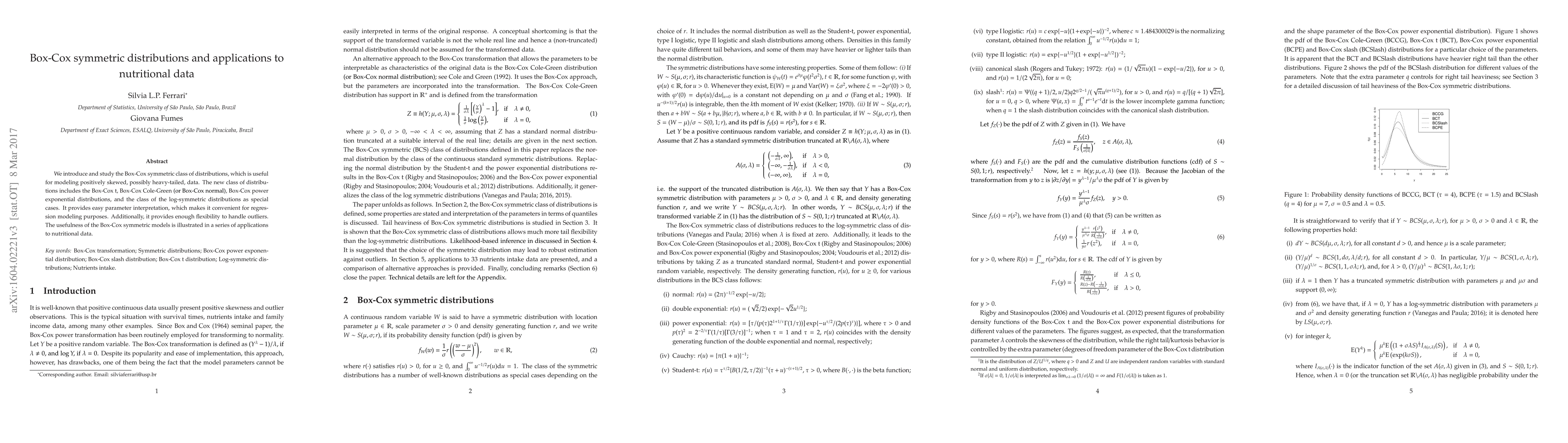 This paper introduces the Box-Cox symmetric class of distributions, which effectively models positively skewed, possibly heavy-tailed data, including special cases like the Box-Cox t and Box-Cox power exponential distributions. The method is demonstrated through its application to nutritional data, showcasing its flexibility and ease of parameter interpretation.