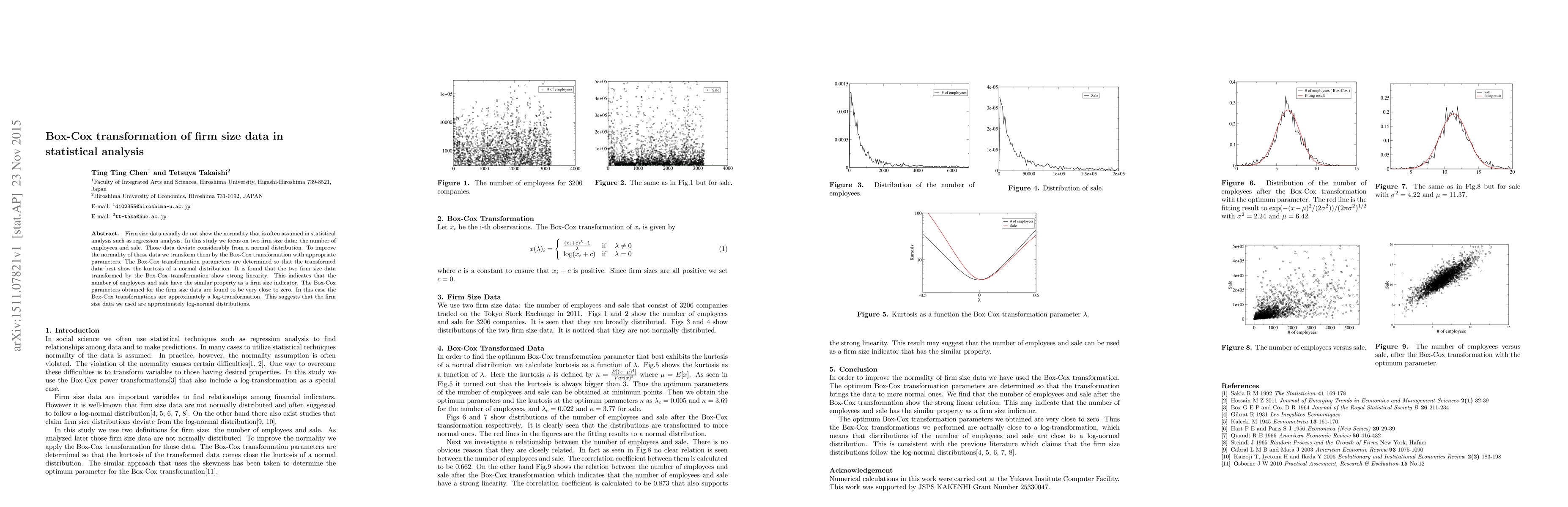This study applies the Box-Cox transformation to firm size data, specifically the number of employees and sales, to improve their normality for statistical analysis. The transformation parameters were chosen to minimize deviation from a normal distribution, revealing that the transformed data exhibit strong linearity, indicating log-normality.