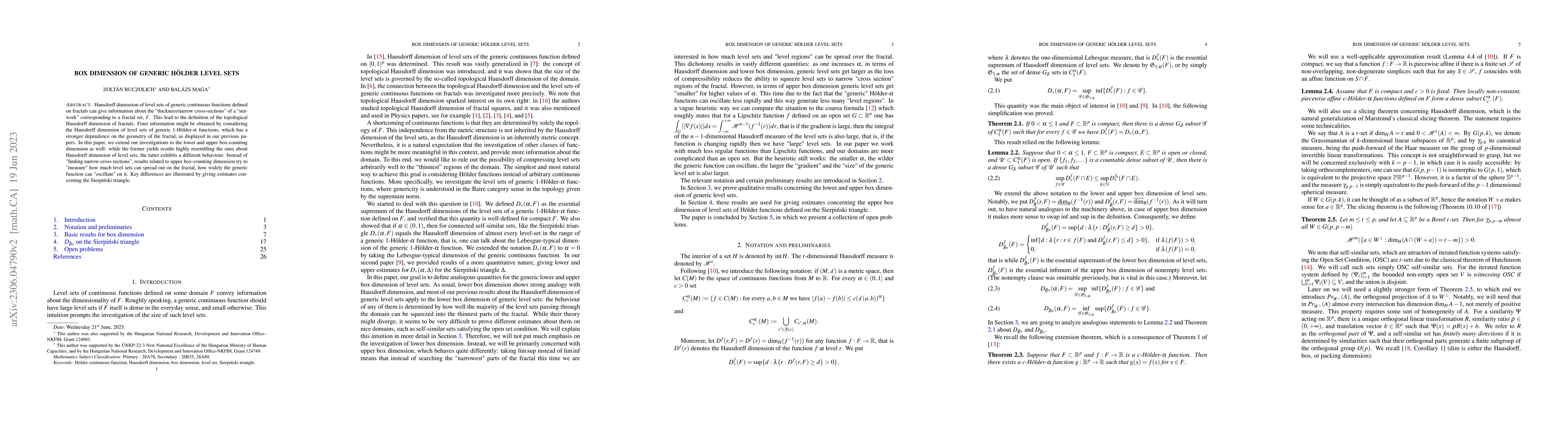 Hausdorff dimension of level sets of generic continuous functions defined on fractals can give information about the "thickness/narrow cross-sections" "network" corresponding to a fractal set, $F$. This lead to the definition of the topological Hausdorff dimension of fractals. Finer information might be obtained by considering the Hausdorff dimension of level sets of generic $1$-H\"older-$\alpha$ functions, which has a stronger dependence on the geometry of the fractal, as displayed in our previous papers. In this paper, we extend our investigations to the lower and upper box-counting dimension as well: while the former yields results highly resembling the ones about Hausdorff dimension of level sets, the latter exhibits a different behaviour. Instead of "finding narrow-cross sections", results related to upper box-counting dimension try to "measure" how much level sets can spread out on the fractal, how widely the generic function can "oscillate" on it. Key differences are illustrated by giving estimates concerning the Sierpi\'nski triangle.