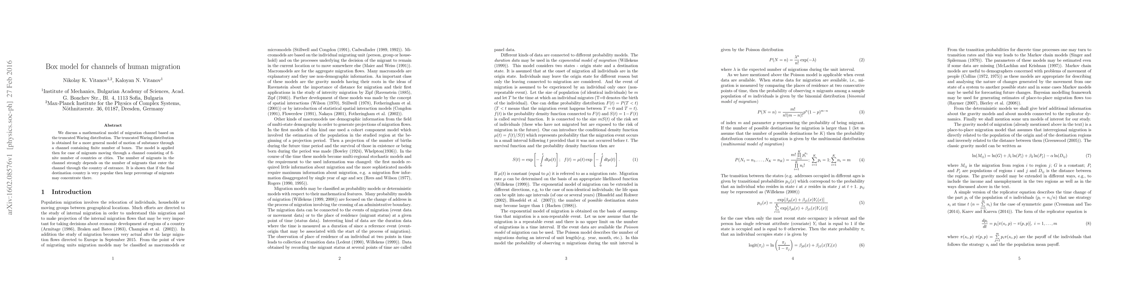 We discuss a mathematical model of migration channel based on the truncated Waring distribution. The truncated Waring distribution is obtained for a more general model of motion of substance through a channel containing finite number of boxes. The model is applied then for case of migrants moving through a channel consisting of finite number of countries or cities. The number of migrants in the channel strongly depends on the number of migrants that enter the channel through the country of entrance. It is shown that if the final destination country is very popular then large percentage of migrants may concentrate there.