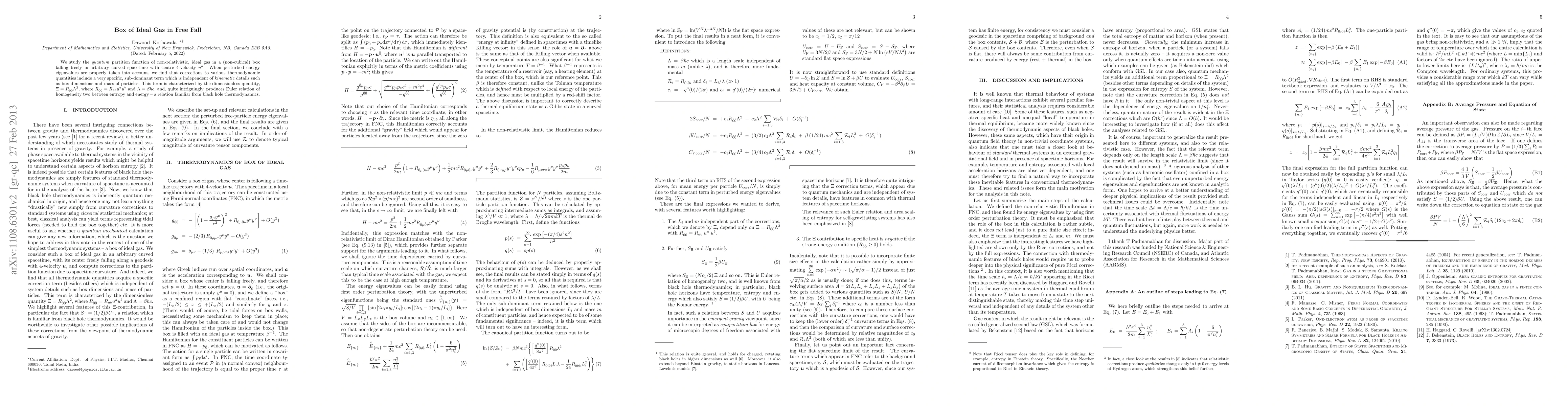 We study the \textit{quantum} partition function of non-relativistic, ideal gas in a (non-cubical) box falling freely in arbitrary curved spacetime with centre 4-velocity u^a. When perturbed energy eigenvalues are properly taken into account, we find that corrections to various thermodynamic quantities include a very specific, sub-dominant term which is independent of \textit{kinematic} details such as box dimensions and mass of particles. This term is characterized by the dimensionless quantity, \Xi=R_00 \Lambda^2, where R_00=R_ab u^a u^b and \Lambda=\beta \hbar c, and, quite intriguingly, produces Euler relation of homogeneity two between entropy and energy -- a relation familiar from black hole thermodynamics.