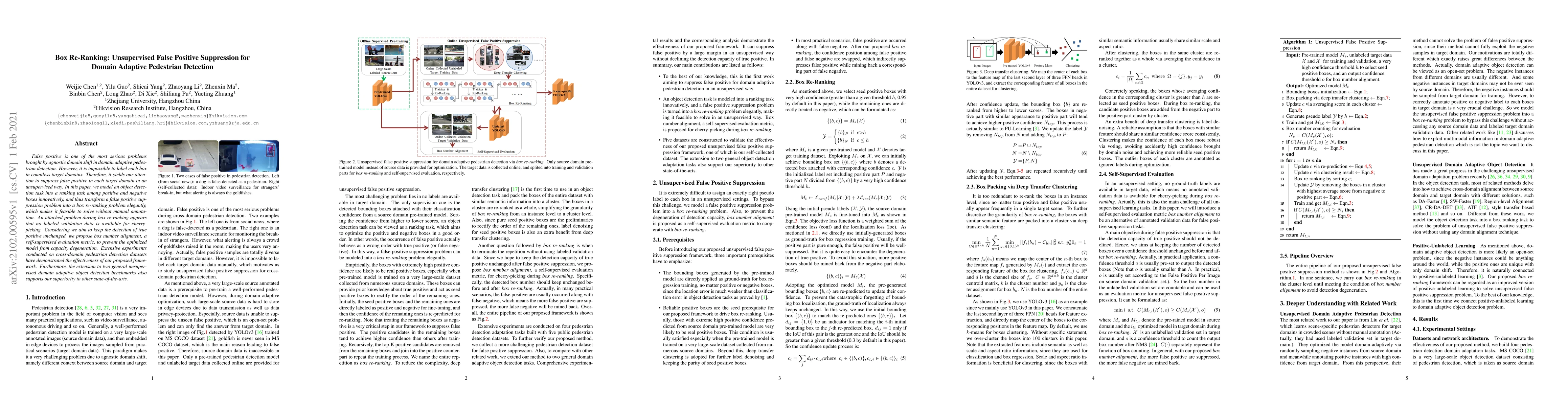 False positive is one of the most serious problems brought by agnostic domain shift in domain adaptive pedestrian detection. However, it is impossible to label each box in countless target domains. Therefore, it yields our attention to suppress false positive in each target domain in an unsupervised way. In this paper, we model an object detection task into a ranking task among positive and negative boxes innovatively, and thus transform a false positive suppression problem into a box re-ranking problem elegantly, which makes it feasible to solve without manual annotation. An attached problem during box re-ranking appears that no labeled validation data is available for cherrypicking. Considering we aim to keep the detection of true positive unchanged, we propose box number alignment, a self-supervised evaluation metric, to prevent the optimized model from capacity degeneration. Extensive experiments conducted on cross-domain pedestrian detection datasets have demonstrated the effectiveness of our proposed framework. Furthermore, the extension to two general unsupervised domain adaptive object detection benchmarks also supports our superiority to other state-of-the-arts.