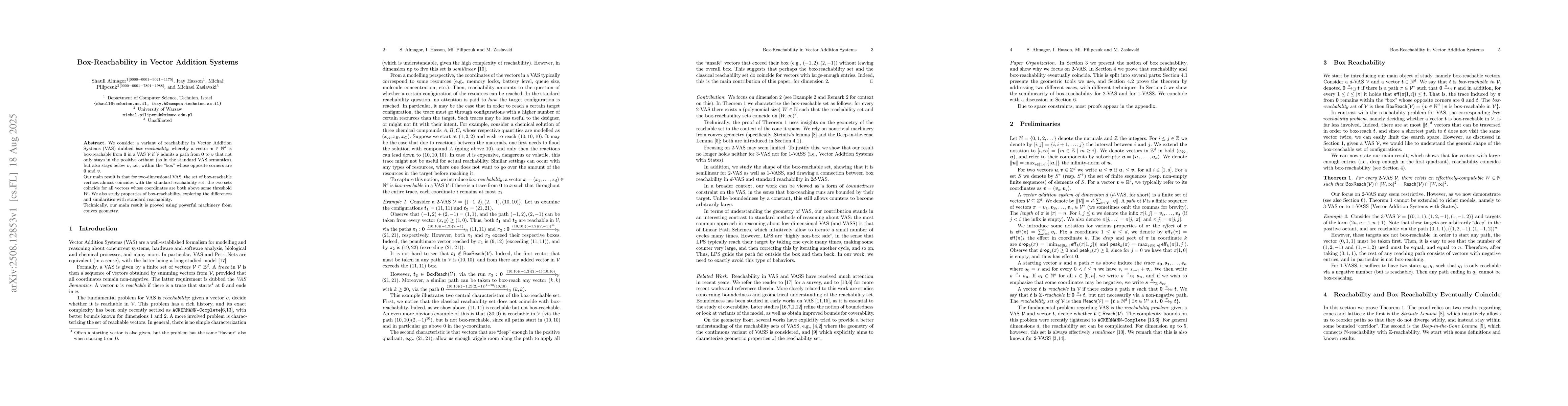 We consider a variant of reachability in Vector Addition Systems (VAS) dubbed \emph{box reachability}, whereby a vector $v\in \mathbb{N}^d$ is box-reachable from $0$ in a VAS $V$ if $V$ admits a path from $0$ to $v$ that not only stays in the positive orthant (as in the standard VAS semantics), but also stays below $v$, i.e., within the ``box'' whose opposite corners are $0$ and $v$. Our main result is that for two-dimensional VAS, the set of box-reachable vertices almost coincides with the standard reachability set: the two sets coincide for all vectors whose coordinates are both above some threshold $W$. We also study properties of box-reachability, exploring the differences and similarities with standard reachability. Technically, our main result is proved using powerful machinery from convex geometry.