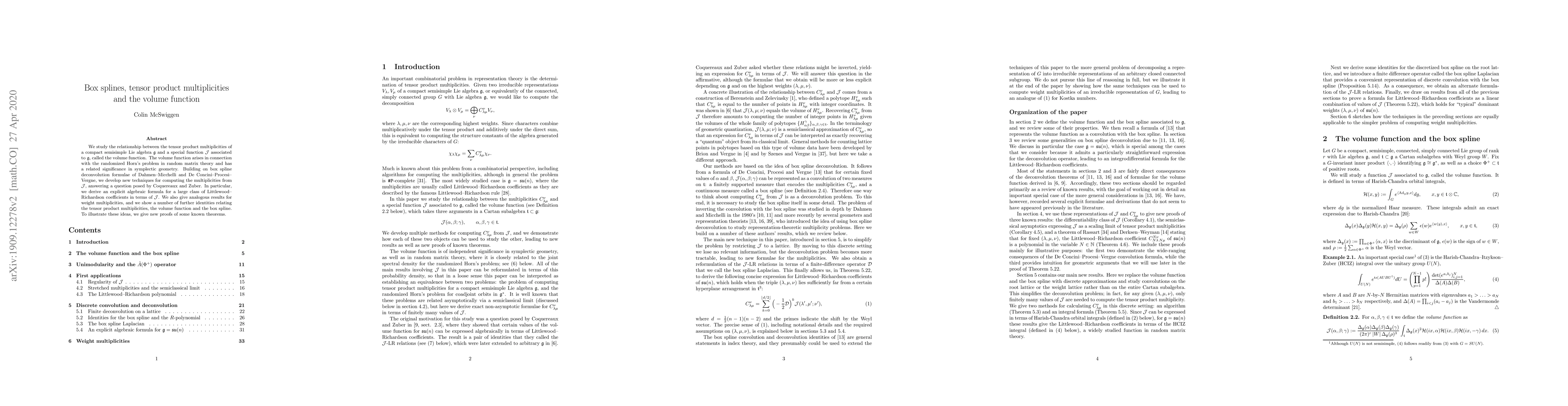 We study the relationship between the tensor product multiplicities of a compact semisimple Lie algebra $\mathfrak{g}$ and a special function $\mathcal{J}$ associated to $\mathfrak{g}$, called the volume function. The volume function arises in connection with the randomized Horn's problem in random matrix theory and has a related significance in symplectic geometry. Building on box spline deconvolution formulae of Dahmen-Micchelli and De Concini-Procesi-Vergne, we develop new techniques for computing the multiplicities from $\mathcal{J}$, answering a question posed by Coquereaux and Zuber. In particular, we derive an explicit algebraic formula for a large class of Littlewood-Richardson coefficients in terms of $\mathcal{J}$. We also give analogous results for weight multiplicities, and we show a number of further identities relating the tensor product multiplicities, the volume function and the box spline. To illustrate these ideas, we give new proofs of some known theorems.