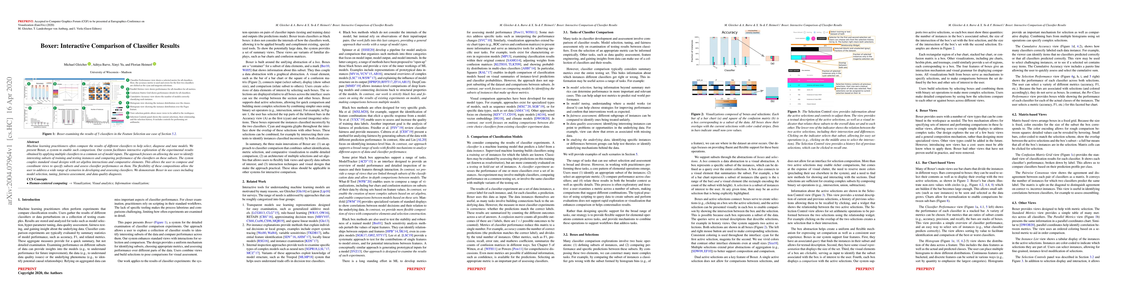 Machine learning practitioners often compare the results of different classifiers to help select, diagnose and tune models. We present Boxer, a system to enable such comparison. Our system facilitates interactive exploration of the experimental results obtained by applying multiple classifiers to a common set of model inputs. The approach focuses on allowing the user to identify interesting subsets of training and testing instances and comparing performance of the classifiers on these subsets. The system couples standard visual designs with set algebra interactions and comparative elements. This allows the user to compose and coordinate views to specify subsets and assess classifier performance on them. The flexibility of these compositions allow the user to address a wide range of scenarios in developing and assessing classifiers. We demonstrate Boxer in use cases including model selection, tuning, fairness assessment, and data quality diagnosis.